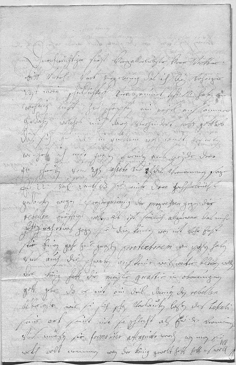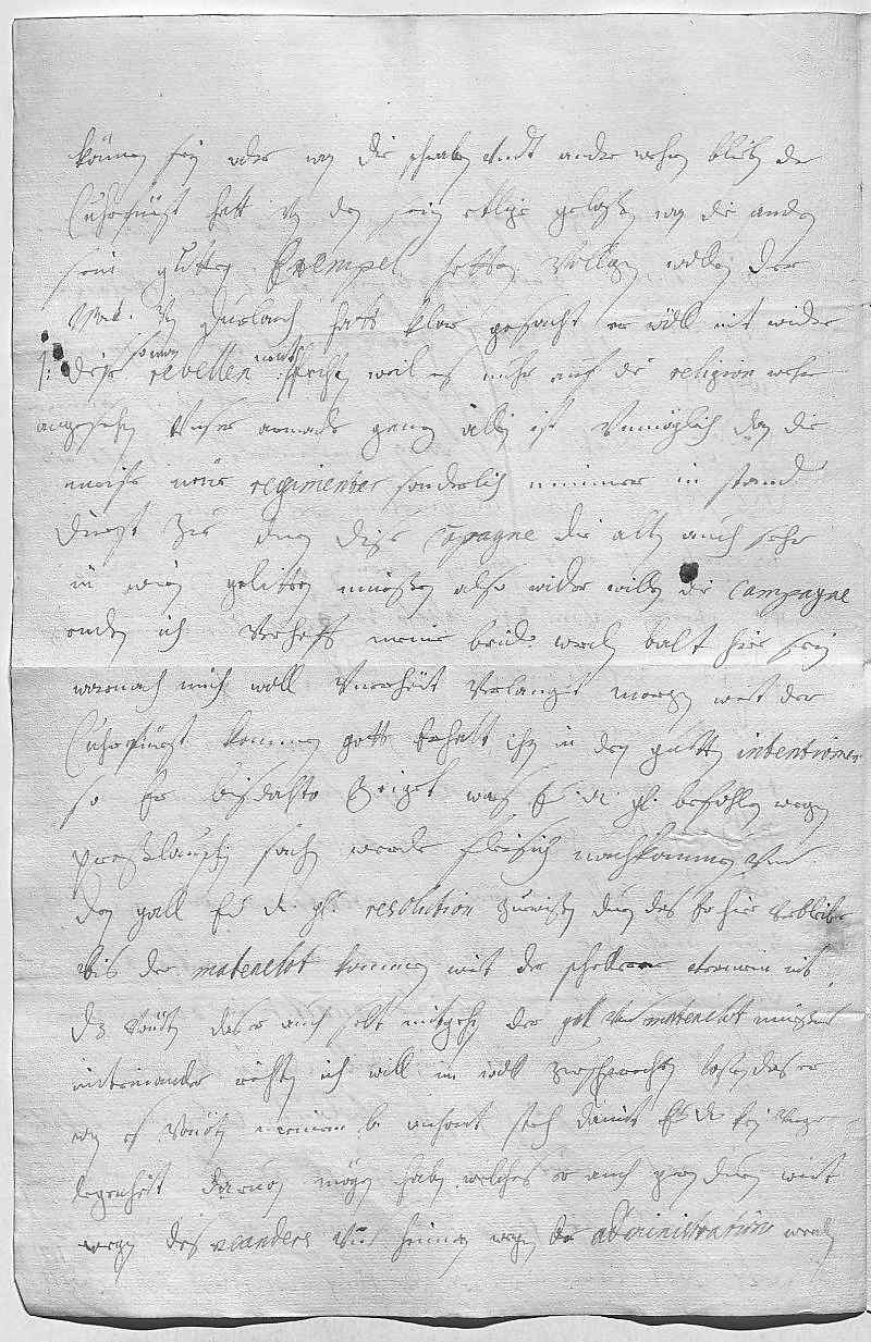 0001Durchleüchtiger Fürst, herz allerliebster herr vatter 0002Bitt vnterdehnigst vmb vergebung, das ich bey vohriger 0003post mein schuldichkeit verabsaumet. Ihr Mayestät haben ein 0004wehnig luft zue schepfen ein reisel auf Cammer 0005gedahn, welches mich daran verhindert hatt. Gottlob, 0006das sich ewer Durchlaucht in guettem wohlstandt befinden, 0007welches ich mit großen freüden aus beyde dero 0008gnädige schreiben vom 29ten passato vnd 8ten dis vernommen. Sage 0009ewer Durchlaucht vnterdehnigsten dankh, das sie mihr dero hochsterleüchte 0010gedanken wegen prosequirung der progressen gegen die 0011rebellen eröffnen wollen. Es ist freilich alzuewar, das mihr 0012hetten noch etwas gegen sie duen können, wan nit vohr erst 0013sie einen gahr zue großen protectorem an Pohlen haben 0014vnd auch die schwaben auf keine weis weiter bleiben wollen. 0015Der König hatt die meiste quartir in Oberungern, 0016gott gebe, das er nit ein deil daruon den rebellen 0017überlaße, wie sie sich schon verlauten laßen. Des Tekeli 0018seine ort seint nit so schlecht, als ewer Durchlaucht vermeinen, 0019vnd müeßen sie formaliter attaquirt werden, wan man sie 0020wekh wolt nemmen. Wan der König gewolt hett, hett es woll