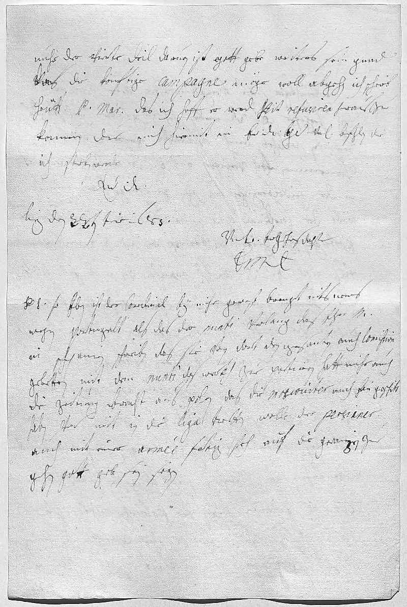 0019nuhr der vierte deil daruon ist, gott gebe weiters sein gnad, 0020das die könftige campagne möge woll abgehn. Ich schreib 0021heütt Pater Marcus, das ich hoff, er werd nit refusiren heraus zue 0022kommen. Due mich hiermit in ewer Durchlaucht gnade vnterdehnigst befehlen, die 0023ich sterben werde 0024ewer Durchlaucht 0025vnterdehnigst trewgehorsamste dochter 0026EMT 0027Linz den 22ten jener 16830028Postscriptum So eben ist der Cardinal bey mihr gewest, brenget niks news 0029wegen Portugall als das der Nunti verlang, das ihre Mayestät 0030in Schpanien schreiben, das sie von dort den gesanten auch comission 0031gebetten, mit dem Nunti das werkh zue portiren. Hatt mihr auch 0032die zeitung bracht aus Polen, das die moscouiter auch hin geschikt 0033haben vnd mit in die liga tretten wollen, der persianer 0034auch mit einer armée fertig steh auf die granizen zue 0035gehen, gott geb sein segen.