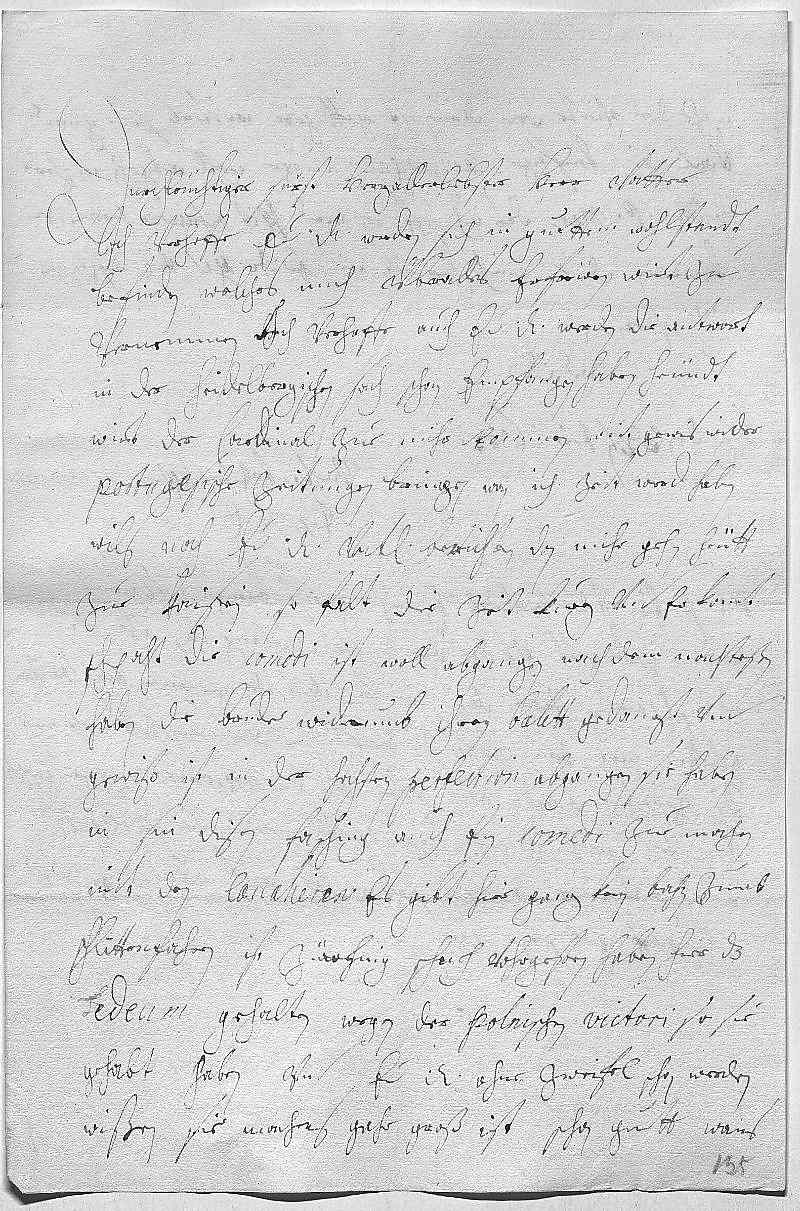 0001Durchleüchtiger Fürst, herz allerliebster herr vatter 0002Ich verhoffe, ewer Durchlaucht werden sich in guettem wohlstandt 0003befinden, welches mich überalles erfrewen wirt zu 0004vernemmen. Ich verhoffe auch, ewer Durchlaucht werden die antwort 0005in der heidelbergischen sach schon empfangen haben. Heündt 0006wirt der Cardinal zue mihr kommen, wirt gewis wider 0007portugesische zeitungen bringen, wan ich zeit werd haben 0008wils noch ewer Durchlaucht vnterdehnigst berichten, dan mihr gehn heütt 0009zur Kaiserin, so falt die zeit kurz, vnd er komt 0010schpaht. Die comedi ist woll abgangen, nach dem nachteßen 0011haben die bruder widerumb ihren balett gedanzt vnd 0012gewiß ist in der hochsten perfection abgangen. Sie haben 0013in sin, disen fasching auch ein comedi zue machen 0014mit den caualiren. Es gibt hier ganz kein bahn zumb 0015schlittenfahren, ist züwehnig schneh. Vohrgestern haben hier das 0016tedeum gehalten wegen der polnischen victori, so sie 0017gehabt haben vnd ewer Durchlaucht ohne zweifel schon werden 0018wißen. Sie machens gahr groß, ist schon guett, wans