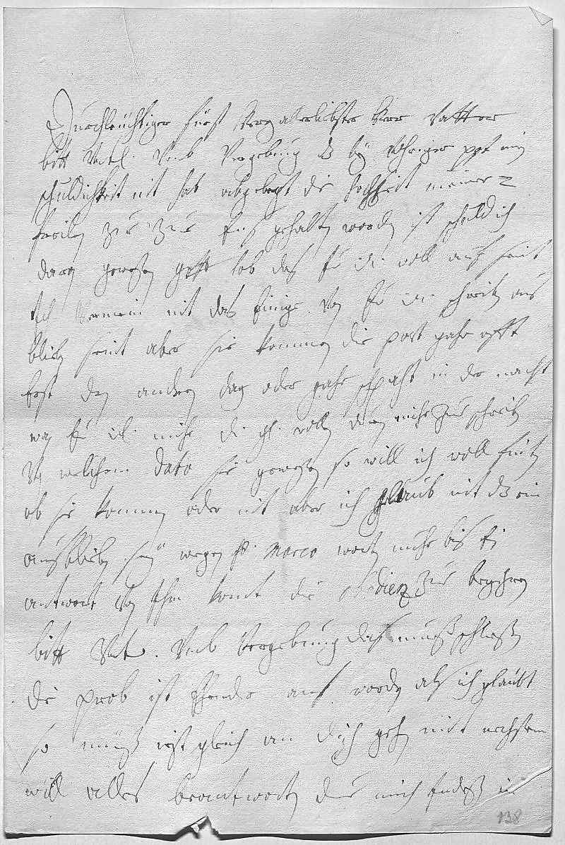 0001Durchleüchtiger Fürst, herz allerliebster herr vatter 0002Bitt vnterdehnigst vmb vergebung, das bey vohriger post mein 0003schuldichkeit nit hab abgelegt, die hochzeit meiner 2 0004freilen zue zue Ens gehalten worden, ist schuldich 0005daran geweßen. Gott lob, das ewer Durchlaucht woll auf seint. 0006Ich vermein nit, das einige von ewer Durchlaucht schreiben aus 0007blieben seint, aber sie kommen die post gahr offt 0008erst den andren dag oder gahr schpaht in der nacht. 0009Wan ewer Durchlaucht mihr die gnade wollen duen, mihr zue schreiben, 0010von welchem dato sie gewesen, so will ich woll finten, 0011ob sie kommen oder nit, aber ich glaub nit, das ein 0012ausblieben sey. Wegen Pater Marco warten nuhr, bis ein 0013antwort von ihm komt, die obedienz zue begehren. 0014Bitt vnterdehnigst vmb vergebung, das mueß schließen, 0015die prob ist ehender aus worden als ich glaubt, 0016so müsen iezt gleich an disch gehen. Mit nechstem 0017will alles beantworten, due mich indeßen in