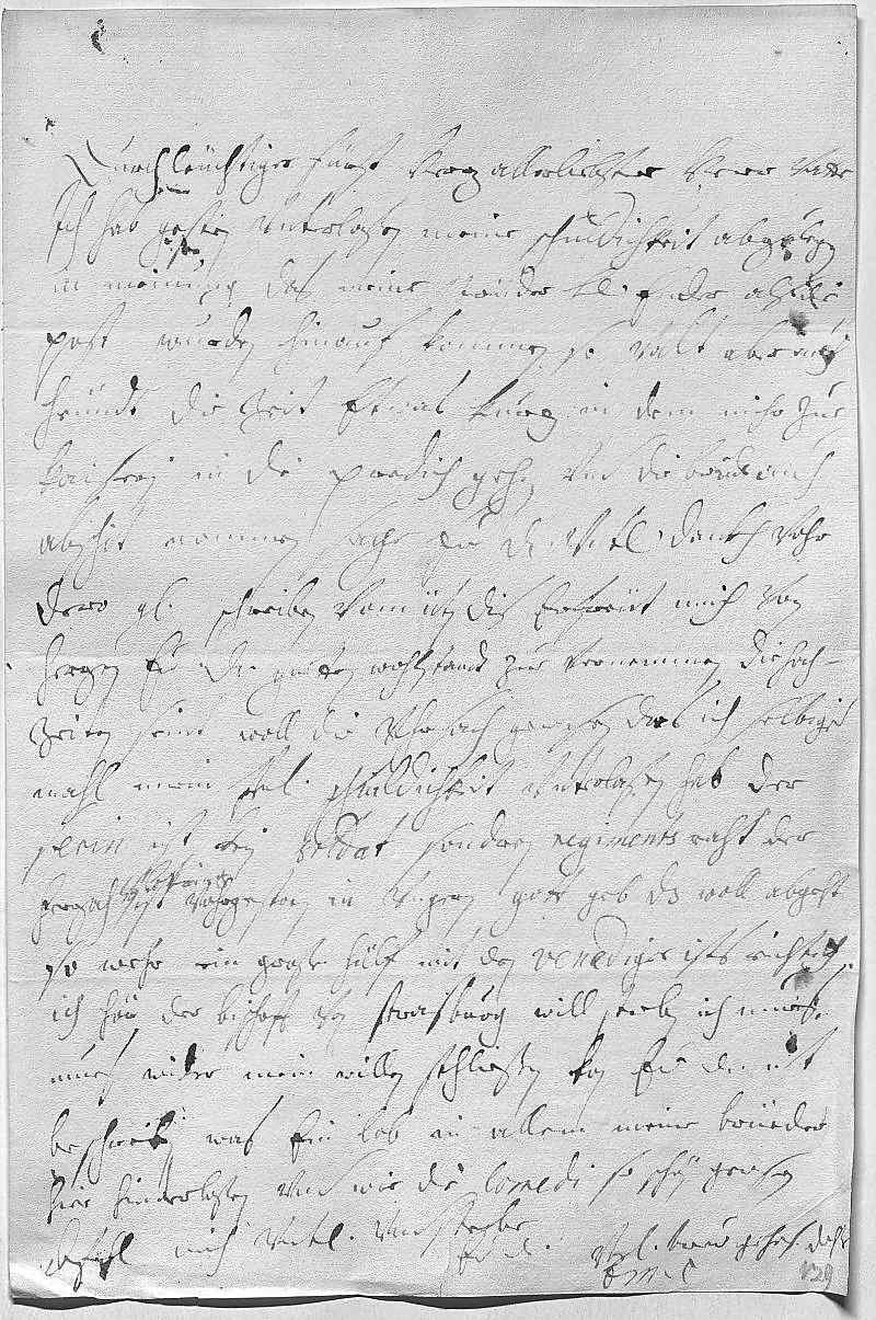 0001Durchleüchtiger Fürst, herzallerliebster herr vatter0002Ich hab gestren vnterlaßen meine schuldichkeit abzulegen 0003in meinung, das meine brüder Liebden ender als die 0004post wurden hinauf kommen, so valt aber auch 0005heündt die zeit etwas kurz, in dem mihr zue der0006Kaiserin in die predich gehen vnd die brüder auch 0007abschit nemmen. Sage ewer Durchlaucht vnterdehnigsten dankh vohr 0008dero gnädiges schreiben vom 11ten dis. Erfreüt mich von 0009herzen, ewer Durchlaucht guetten wohlstand zue vernemmen. Die hoch- 0010zeiten seint woll die vhrsach gewesen, das ich selbiges 0011mahl mein vnterdehnigste schuldichkeit vnterlaßen hab. Der 0012Serin ist kein soldat, sondern Regiments Raht. Der 0013Herzoch von Lotringen ist vohrgestern in Vngern, gott geb, das woll abgeht, 0014so wehr ein große hülf. Mit den venediger ists richtich. 0015Ich hör, der Bischof von Strasburg will sterben. Ich mues 0016mues wider mein willen schließen. Kan ewer Durchlaucht nit 0017beschreiben, was für ein lob in allem meine brüeder 0018hier hinterlaßen vnd wie die comedi so schön gewesen. 0019Befehl mich vnterdehnigst vndt sterbe 0020ewer Durchlaucht 0021vnterdehnigst trew gehorsamste dochter 0022EMT