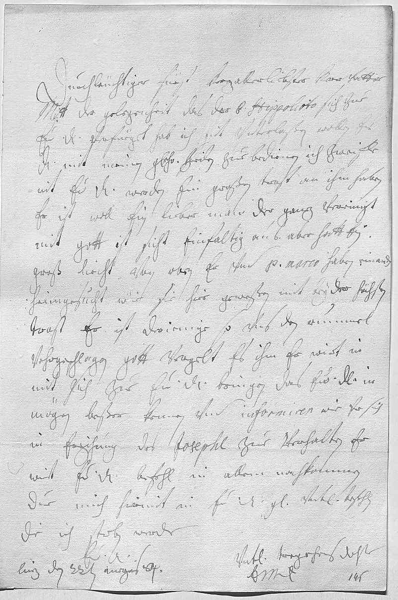 0001Durchleüchtiger Fürst, herzallerliebster herr vatter 0002Mit der gelegenheit, das der Pater Hippolioto sich zue 0003ewer Durchlaucht verfüeget, hab ich nit vnterlaßen wollen, ewer 0004Durchlaucht mit meinen gehorsamsten zeilen zue bedienen. Ich zweifle 0005nit, ewer Durchlaucht werden ein großen trost an ihm haben. 0006Er ist woll ein lieber man, der ganz vereinigt 0007mit gott ist, sicht einfaltig aus, aber hatt ein 0008groß liecht von oben. Er vnd Pater Marco haben einander 0009heimgesucht, wie sie hier geweßen, mit beyder höchsten 0010trost. Er ist derienige, so vns den Rummel 0011vohrgeschlagen, gott vergelt es ihm. Er wirt in 0012mit sich zue ewer Durchlaucht bringen, das ewer Durchlaucht in 0013mögen beßer kennen vnd informiren, wie er sich 0014in erzihung des Josephl zue verhalten. Er 0015wirt ewer Durchlaucht befehl in allem nachkommen. 0016Due mich hirmit in ewer Durchlaucht gnade vnterdehnigst befehlen, 0017die ich sterben werde 0018ewer Durchlaucht 0019vnterdehnigst trewgehorsamste dochter 0020EMT 0021Linz den 22ten merz 1684