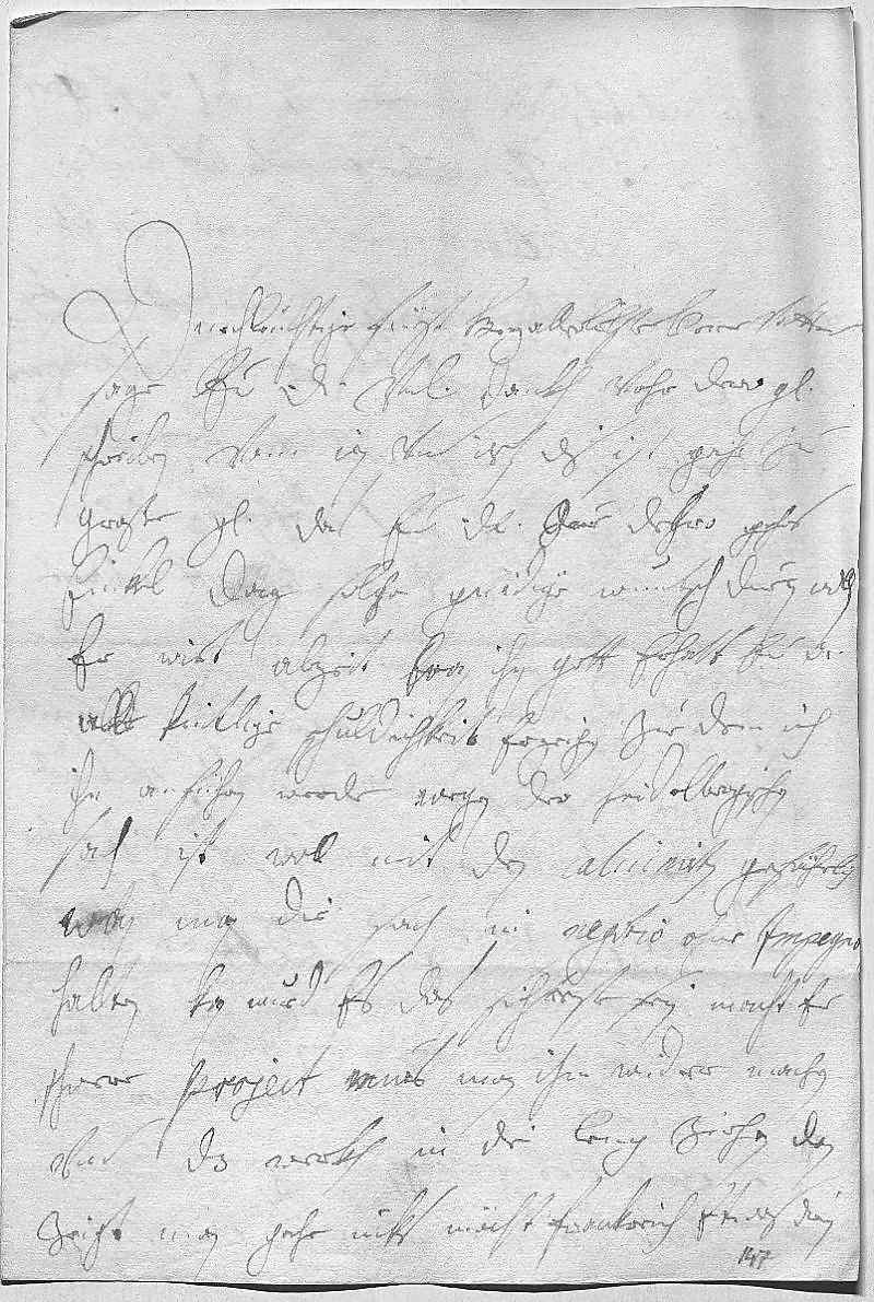 0001Durchleüchtiger Fürst, herz allerlibster herr vatter 0002Sage ewer Durchlaucht vnterdehnigsten dankh vohr dero gnädiges 0003schreiben vom 17 vnd 18ten dis. Ist gahr zu 0004große gnade, das ewer Durchlaucht zue dero gehorsamsten 0005enikel dag solche gnädige wuntsch duen wollen, 0006er wirt alzeit, wan ihn gott erhalt, ewer Durchlaucht 0007alle kintlige schuldichkeit erzeichen, zue dem ich 0008ihn anführen werde. Wegen der heidelbergischen 0009sach, ist woll mit den caluinisten gefährlich, 0010wan man die sach in negotio ohne impegno 0011halten kan, wurd es das sicherste sein. Macht er 0012schwere project, mues man ihm wider machen 0013vnd das werkh in die leng ziehen, dan 0014zeigt man gahr nikhs, möcht Frankreich etwas drin
