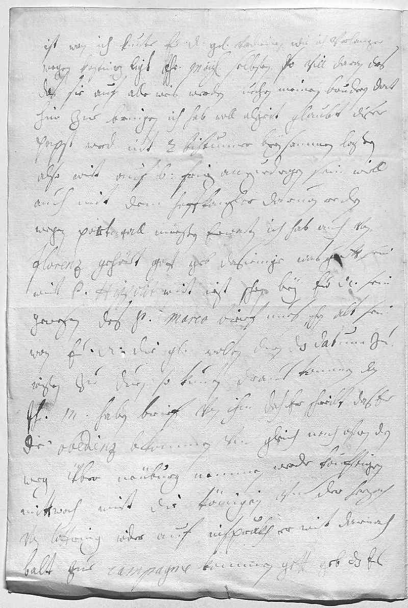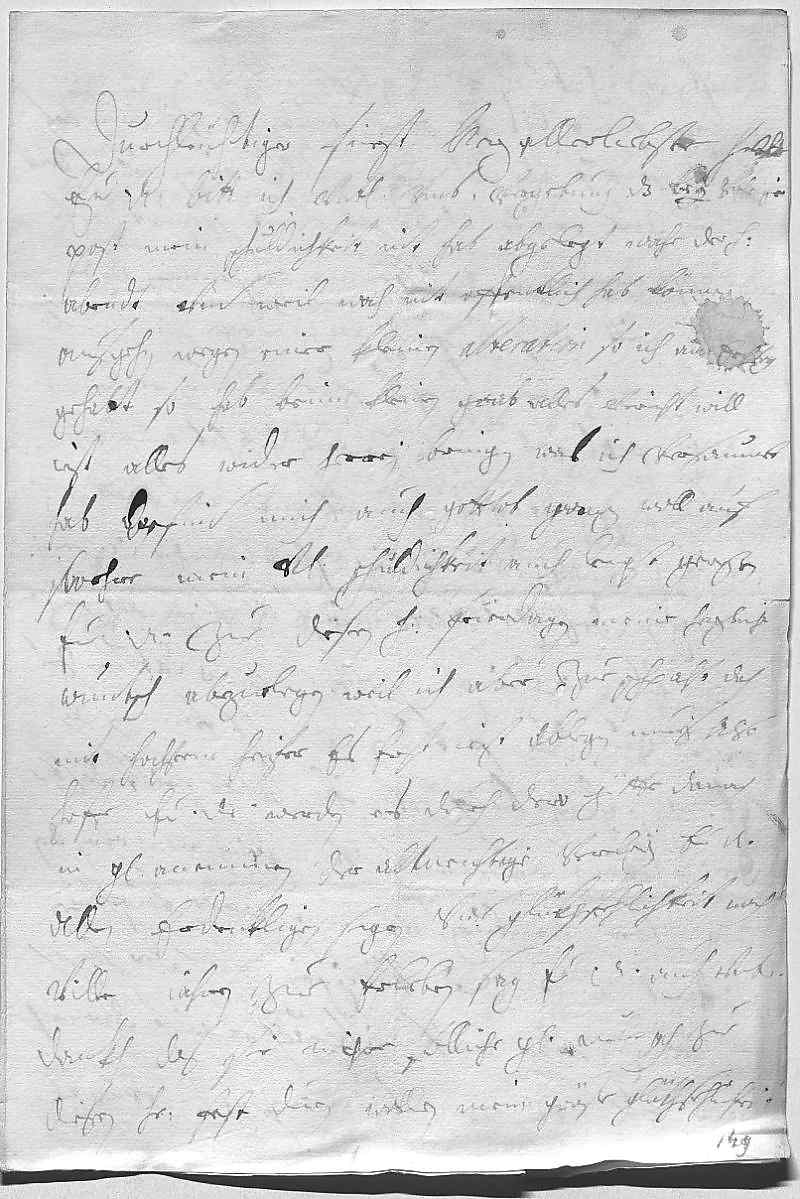 0001Durchleüchtiger Fürst, herz allerliebster herr vater 0002Ewer Durchlaucht bitt ich vnterdehnigst vmb vergebung, das bey vohriger 0003post mein schuldichkeit nit hab abgelegt, wahr der heilige 0004abendt, vnd weil noch nit offentlich hab können 0005ausgehn wegen einer kleinen alteration, so ich am erchtag 0006gehabt, so hab beim kleinen grab alles vericht. Will 0007izt alles wider herrein bringen, was ich versaumet 0008hab. Befind mich auch gottlob ganz woll auf. 0009Wehre mein vnterdehnigste schuldichkeit auch lengst geweßen, 0010ewer Durchlaucht zue diesen heiligen feierdagen meine herzliche 0011wuntsch abzuelegen, weil ich aber zue schpaht, das 0012mit hochstem heifer es erst izt ablegen mues, also 0013hoffe, ewer Durchlaucht werden es durch dero güette danoch 0014in gnaden anemmen. Der altmechtige verley ewer Durchlaucht, 0015allen erdenkligen segen vnd glükhsehlichkeit noch 0016ville iahren zue erleben. Sag ewer Durchlaucht auch vnterdehnigst 0017dankh, das sie mihr solliche gnädige wunsch zue 0018diesen heiligen fest duen wollen, mein gröste glükhsehlichkeit