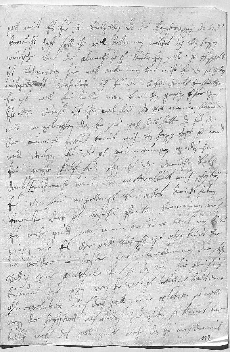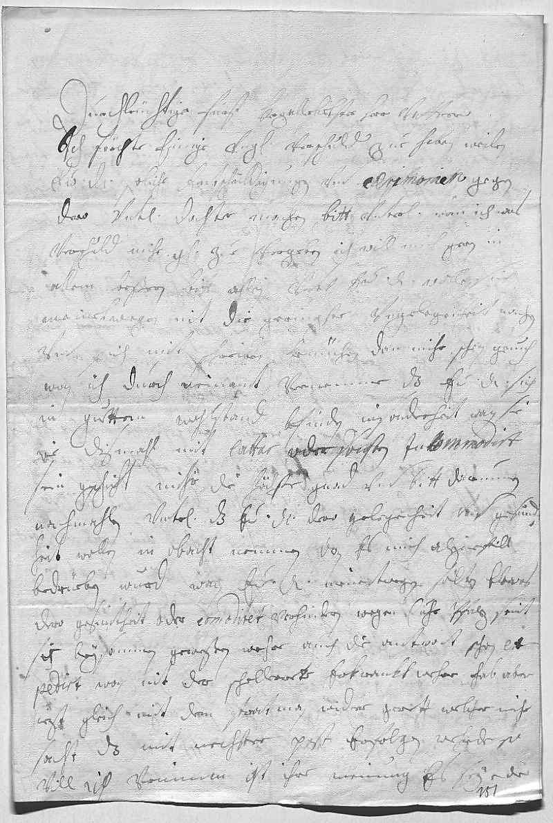 0001Durchleüchtiger Fürst, herzallerliebster herr vatter 0002Ich förchte einige vngnade verschuld zue haben, weilen 0003ewer Durchlaucht soliche entschuldigungen vnd cerimonien gegen 0004dero vnterdehnigste dochter machen. Bitt vnterdehnigst, wan ich was 0005verschuld, mihr gnädigst zue vergeben, ich will mich gern in 0006allem beßern. Bitt allein vnterdehnigst, ewer Durchlaucht wollen sich 0007meinetwegen mit die geringste vngelegenheit machen 0008vnd sich mit schreiben bemühen, dan mihr schon genuch, 0009wan ich durch iemant vernemme, das ewer Durchlaucht sich 0010in guttem wohlstand befinden, in sonderheit wan sie, 0011wie dismahl, mit cattar oder sonsten inkommodirt 0012sein, geschicht mihr die höchste gnad. Vnd bitt darumen 0013nachmahlen vnterdehnigst, das ewer Durchlaucht dero gelegenheit vnd gesund- 0014heit wollen in obacht nemmen, dan es mich alzuefill 0015bedrüeben wurd, wan ewer Durchlaucht meinetwegen solten etwas 0016dero gesuntheit oder comoditet verhindern. Wegen Cuhr Pfalz seint 0017sie beysammen geweßen, wehre auch die antwort schon ex- 0018pedirt, wan nit der Schellerer erkrankt wehre, hab aber 0019iezt gleich mit dem Stratman wider gerett, welcher mihr 0020sacht, das mit nechster post erfolgen wehrde. So 0021vill ich vernimme, ist ihre meinung, es seye die