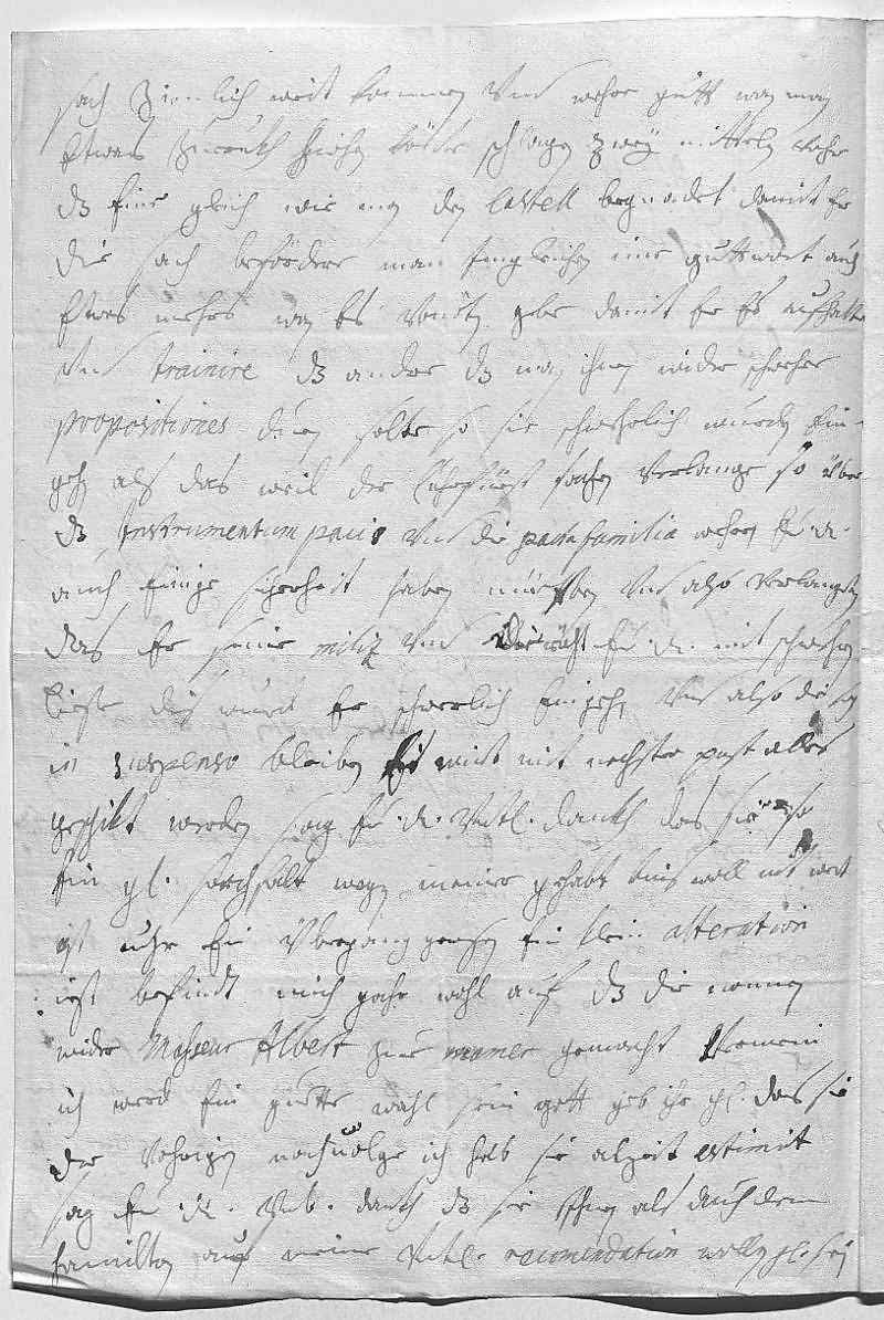 0022sach zimlich weit kommen vnd wehre gutt, wan man 0023etwas zuerukh zihen könte. Schlagen zwey mitteln vohr, 0024das eine, gleich wie man den Castell begnadet, damit er 0025die sach befördere, man imgleichen ime gutt wort, auch 0026etwas mehrs, wan es vonöten, gebe, damit er es aufhalte 0027vnd trainire, das andre, das man ihnen wider schwehre 0028propositiones duen solte, so sie schwehrlich würden ein- 0029gehen, als das, weil der Cuhrfürst sachen verlange, so über 0030das instrumentum pacis vnd die pacta familia wehren, ewer Durchlaucht 0031auch einige sicherheit haben müesten vnd also verlangeten, 0032das er seine miliz vnd die räht ewer Durchlaucht mit schwehren 0033ließe. Dis wurd er schwerlich eingehn vnd also die sach 0034in suspenso bleiben. Es wirt mit nechster post alles 0035geschikt werden. Sag ewer Durchlaucht vnterdehnigsten dankh, das sie so 0036ein gnädige sorchfalt wegen meiner gehabt, bins woll nit wert, 0037ist nuhr ein übergang gewesen, ein klein alteration, 0038jezt befindt mich gahr wohl auf. Das die nonnen 0039wider Masseur Albert zur Mamer gemacht, vermein 0040ich, werd ein guette wahl sein, gott geb ihr gnade, das sie 0041der vohrigen nachuolge, ich hab sie alzeit estimirt. 0042Sag ewer Durchlaucht vnterdehnigsten dankh, das sie ihnen als auch dem 0043Hamilton auf meine vnterdehnigste recomendation wollen gnädig sein,
