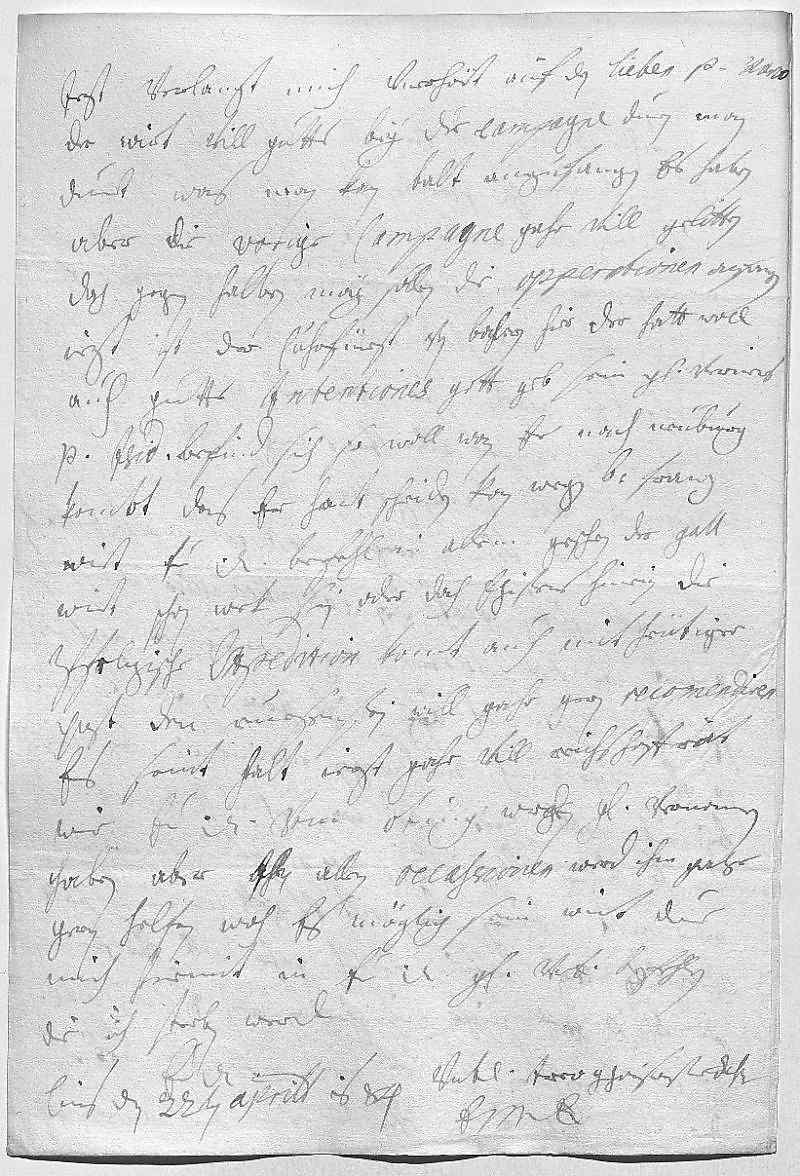 0021Jest verlangt mich vnerhört auf den lieben Pater Marco, 0022der wirt vill gutts bey der campagne duen. Man 0023duet, was man kan, balt anzufangen, es haben 0024aber die vorige campagne gahr vill gelitten, 0025doch gegen halben may sollen die opperationen anfangen. 0026Izt ist der Cuhrfürst von Baihren hier, der hatt woll 0027auch gutte intentiones, gott geb sein gnade verners. 0028Pater Isidor befind sich so woll, wan er nach Neüburg 0029kombt, das er hart scheiden kan. Wegen bruder Franz 0030wirt ewer Durchlaucht befehl in allem geschen, der Gall 0031wirt schon wek sein oder doch ehistens hinein. Die 0032pfelzische expedition komt auch mit heütiger 0033post. Den Ruesenstein will gahr gern recomendiren. 0034Es seint halt iezt gahr vill reichshoffrät, 0035wie ewer Durchlaucht vom Oting werden gnädig vernommen 0036haben, aber ihn allen occassionen werd ihm gahr 0037gern helfen, woh es möglich sein wirt. Due 0038mich hirmit in ewer Durchlaucht gnade vnterdehnigst befehlen, 0039die ich sterben werd 0040ewer Durchlaucht 0041vnterdehnigste trew gehorsamste dochter 0042EMT 0043Lins den 22ten aprill 1684