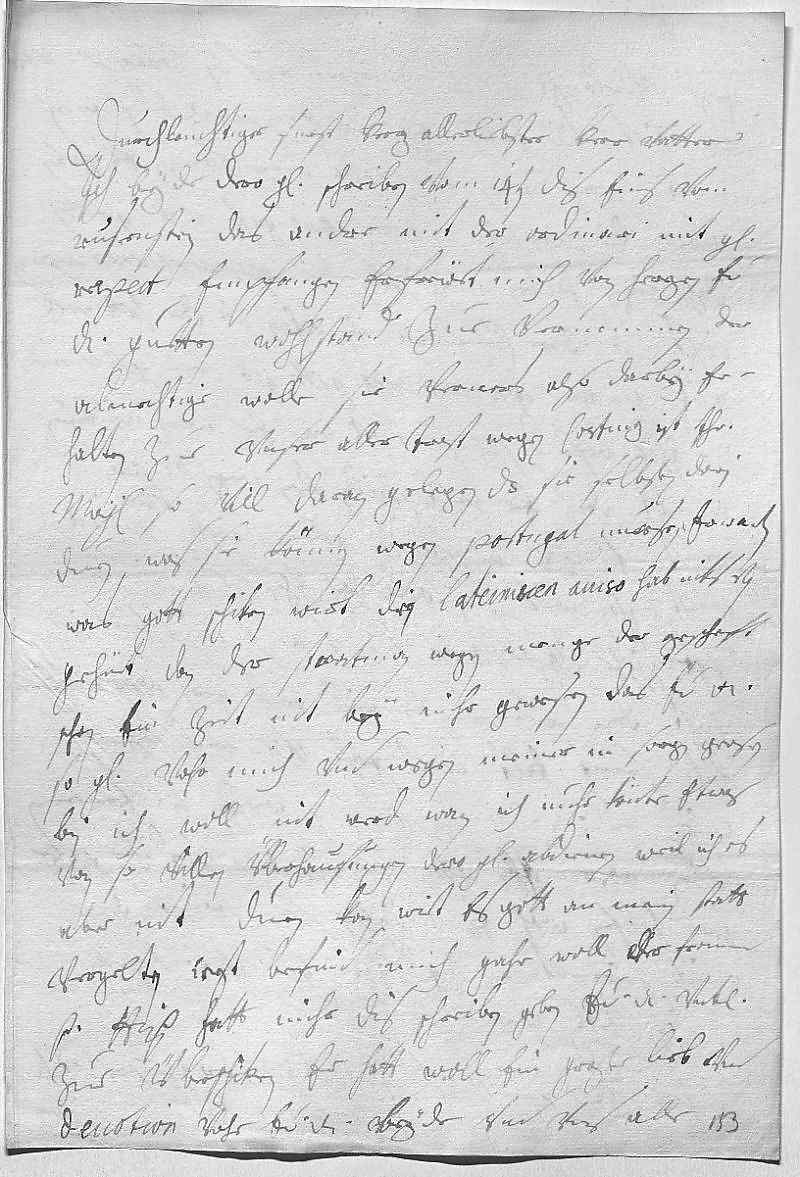 0001Durchleüchtiger Fürst, herz allerliebster herr vatter 0002Ich habe beyde dero gnädige schreiben vom 14ten dis, eins vom 0003Rusenstein, das andre mit der ordinari, mit gehorsamen 0004respect empfangen. Erfrewet mich von herzen, ewer 0005Durchlaucht guetten wohlstand zue vernemmen, der 0006almechtige wolle sie verners also darbey er- 0007halten zue vnser aller trost. Wegen Costniz, ist ihr 0008Mayestät so vill daran gelegen, das sie selbsten darin 0009duen, was sie können. Wegen Portugal müesen erwarten, 0010was gott schiken wirt. Wegen den lateinischen auiso, hab niks von 0011gehört, dan der Stratman wegen menge der gescheft 0012schon ein zeit nit bey mihr geweßen. Das ewer Durchlaucht 0013so gnädig vohr mich vnd wegen meiner in sorgen gewesen, 0014bin ich woll nit werd, wan ich nuhr könte etwas 0015von so villen überhaufungen dero gnade abdienen, weil ich es 0016aber nit duen kan, wirt es gott an mein statt 0017vergelten. Iezt befind mich gahr woll. Der fromme 0018Pater Hippolit hatt mihr dis schreiben geben, ewer Durchlaucht vnterdehnigst 0019zue überschiken, er hatt woll ein große lieb vnd 0020deuotion vohr ewer Durchlaucht beyde vnd vns alle.