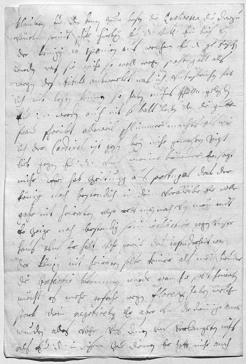 0062klauben, ewer Durchlaucht kenen zum besten die qualiteten, die darzu 0063vonöten seindt. Schike hierbey ewer Durchlaucht vnterdehnig ein brif von 0064der Königin in Spanien, aus welchem ewer Durchlaucht gnädig ersehn 0065werden, was sie mihr so woll wegen Portugall als 0066wegen des tituls antwortet. Was ich vnterstrichen, hab 0067ich nit lesen können, so haben mihrs ihr Mayestät gelesen. 0068Ewer Durchlaucht werden auch nit so balt lesen, dan die guette 0069fraw schreibt alleweil schlimmer, machts als wie 0070ich. Der Cardinal ist gestren bey mihr geweßen, zeigt 0071lieb gegen ewer Durchlaucht vnd meine brüeder . Er sagt 0072mihr, er hab zeitung aus Portugal, das der 0073König noch bestendich in dem verbleibe, er wolle 0074gahr nit heiraten, also rett man noch von nümandt. 0075Er zeige noch bestendig sein inclination gegen vnser 0076haus, vnd er halt vohr gewiß, das, insonderheit wan 0077der König nit heiraten solte, keiner als mein bruder 0078die Infantin bekommen wurde. Wan er solt heiraten, 0079möcht es mehr gefahr wegen Florenz haben, welche 0080stark drin negotireten, er aber vnd der drinige Nunti 0081wurden alles vohr vns duen vnd verlangeten niks 0082als ewer Durchlaucht in disem zue dienen. Er hatt mihr auch