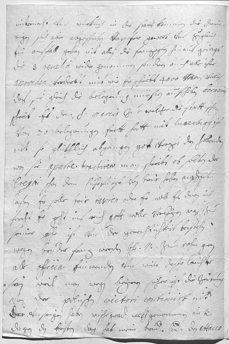 0020miternacht vnd sind würklich in die statt kommen, die drin- 0021nigen sich aber abgeschniten, dapfer gewert vnd zugleich 0022ein ausfall gedan und damit nit allein die franzosen hinaus geiagt, 0023die 3 reuelin wider genommen, sondern auch alle ihre 0024aprochen verderbt mit, wie er schreibt, 4000 man verlust, 0025das sie gleich die belegrung müeßen aufheben. Bornonuile 0026schreib es dem heiligen Narcis zue, welcher die statt schon 0027von 20 belegerungen erett hatt. Mit Luxenburg ist 0028nit so glükhlich abgangen, gott verzei den hollendern, 0029wan sie aparte tractiren. Man schreibt, ob solten der 0030Crequi schon dem Cuhrfürst von Trir haben andeuten 0031laßen, er solle Trir rasiren, oder er woll es duen. Ich 0032förcht, er geht ins Reich, gott wolle verleyen, was zu 0033seiner ehr ist vnd der gerechtichkeit beistehn. 0034Wegen bruder Franz werden ihr Mayestät zu Rohm gern 0035alle officia einwenden, vnd wirt desto leichter 0036sein, weil man wegen Beyern sicher ist. Die zeitung 0037von der polnischen victori continuirt nit. 0038Die vnsrigen haben Wischegrad wekh genommen in 2 0039dagen. Den ersten dag hat mein bruder Ludwig den attacco