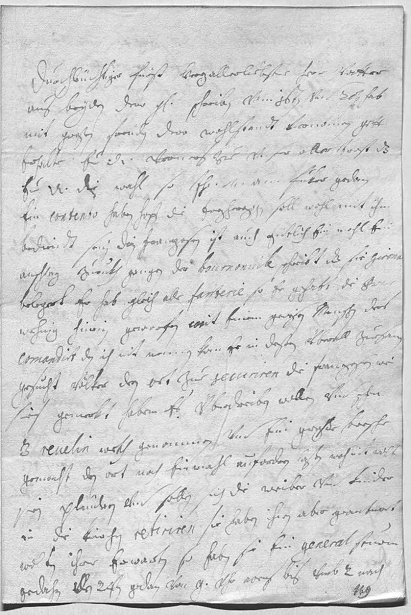 0001Durchleüchtiger Fürst, herz allerliebster herr vatter 0002Aus beyden dero gnädigen schreiben vom 16ten vnd 20ten hab 0003mit großen freüden dero wohlstandt vernomen, gott 0004erhalte ewer Durchlaucht verners zue vnser aller trost. Das 0005ewer Durchlaucht die wahl, so ihr Mayestät am Fuker gedan, 0006ein contento haben, freut mich, hoff, die Erzherzogin soll wohl mit ihm 0007bediendt sein. Den franzosen ist auch entlich ein mahl ein 0008anschag zurukh gangen, der Bournonuile schreibt, das sie Girona 0009belegert. Er hab gleich alle fanterie, so er gehabt, die zwar 0010wehnig, hinein geworfen mit einem gewisen menschen, ders 0011comandirt, den ich nit nennen kan, er in deßen überall zuesamen 0012gesucht völker, den ort zue securiren. Die franzosen, wie 0013sies gemerkt, haben es überdreiben wollen vnd ihm 00143 reuelin wekh genommen vnd ein große bresche 0015gemacht, den ort noch einmahl zur übergabe aufordern laßen, woh nit, wolten0016sie plündern vnd sollen sich die weiber vnd kinder 0017in die kirchen retiriren. Sie haben ihnen aber geantwort, 0018wolten ihrer erwarten. So haben sie ein general sturm 0019gedahn, den 24ten gedan von 9 vhr bis vmb 2 nach