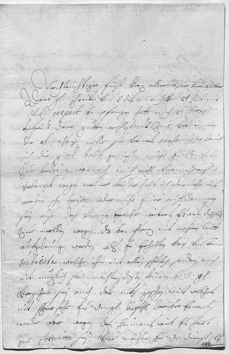 0001Durchleüchtiger Fürst, herz allerliebster herr vatter 0002Dero gnädige schreiben vom 1 dis wie auch vom 8ten hab mit 0003vnterdehnigstem respect empfangen. Hatt mich von herzen 0004erfreüdt, dero guetten wohlstandt zue vernemmen, 0005der almechtige wolle sie verners conseruiren, damit 0006ich die gnad balt genießen möge, ewer Durchlaucht vnterdehnigst 0007zue bedienen, warnoch mich wohl vnauschprechlich 0008verlanget. Wegen meiner brüder halt ich daruohr, izt 0009werden schon beyde oder nuhr einer auf dem weg 0010sein, also das vnotig erachte, weiters etwas disfals 0011zue melden. Wegen das bruder Franz nit mehrer leütt 0012aufgedrungen werden, als er erhalten kan, vnd keine 0013subiecta, welche ihm nit allein schädlich, sondern auch 0014nit nuzlich sein möchten, deßen können ewer Durchlaucht gehorsamst 0015versichert sein, auch das niks geschen wirt, welches 0016nit zuefohr ewer Durchlaucht gnädigen befehl darüber erwarten 0017werde. Aber wegen des Heimans wirt es hart 0018zue schiniren sein, vnd möchte ewer Durchlaucht dienst selbsten