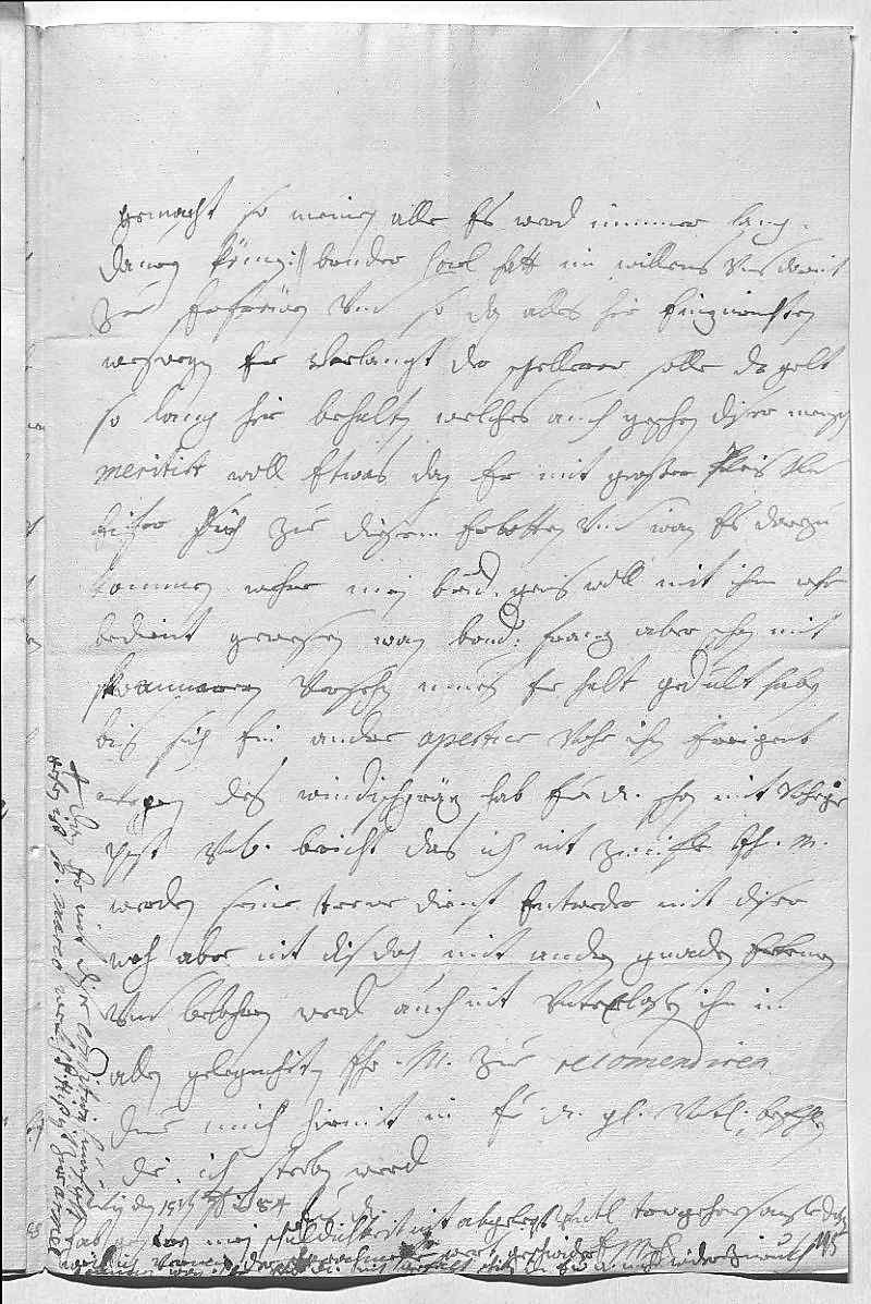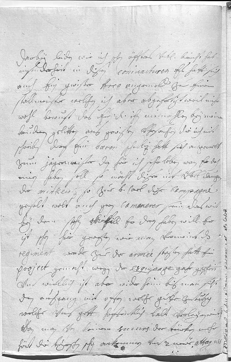 0019darbey leiden, wie ich schon öffters vnterdehnigst bericht hab, 0020insonderheit in disen coniuncturen. Es hatt sich 0021auch ein gwißer Arco angemeld zue einem 0022Stallmeister, welchen ich aber abgefertigt, weil mihr 0023wohl bewust, das ewer Durchlaucht ihn niemahlen bey meinem 0024brudren gelitten aus gewißen vhrsachen, die ich nit 0025schreiben derf. Ein Baron Schedliz hatt sich angemelt 0026zum Jägermeister, den hör ich sehr loben, wan er doch 0027einen haben soll, so möcht diser nit übel daugen. 0028Der Minkewiz, so zue bruder Carl dise campagne 0029gesolt, wolt auch gern Cammerer sein, das wirt 0030bey dem stehn, wiefill er deren haben will. Er 0031ist schon hier geweßen wie man vermeint, das 0032regiment werde zue der armeé stoßen, hatt ein 0033project gemacht wegen der esquipage, gahr gescheit 0034vnd wirtlich, ist aber wider heim, bis man siht 0035den ausgang mit Offen . Welche gutte zeitung, 0036welche vns gott hoffentlich balt verleyen wirt, 0037dan man von keinem sucurs der türken mehr 0038hört. Die beyrschen sind schon ankommen vnd 2 newe attaques