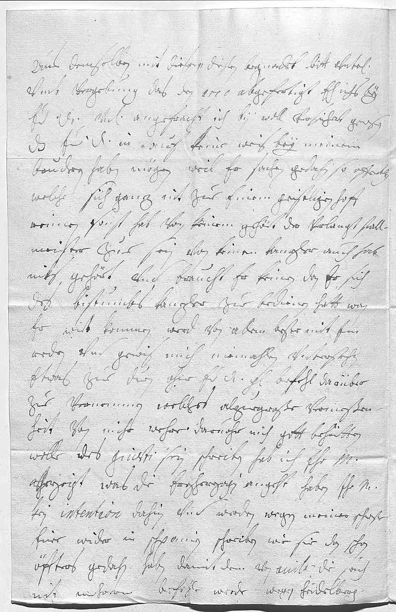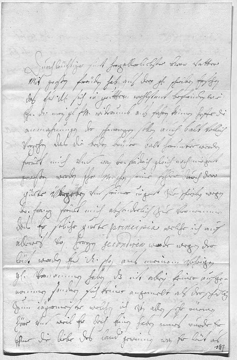 0001Durchleüchtiger Fürst, herzallerliebster herr vatter 0002Mit großen freüden hab aus dero gnädigem schreiben ersehen, 0003das ewer Durchlaucht sich in guttem wohlstant befinden wie auch, dass0004ihr Durchlaucht, mein geliebste fraw mutter, widerumb haben aus fahren können. Hoffe die 0005anmahnungen der schmerzen sollen auch balt vollich 0006vergehen. Das die beden brüder balt herunter werden kommen, 0007freüet mich, vnd wan bruder Fridrich gleich noch nirgent 0008geweßen, werden ihr Mayestät schon seine fehler durch dero 0009güette übergeben vnd seiner iugent zue schreiben. Wegen 0010bruder Franz freüet mich absonderlich zue vernemmen, 0011das er soliche guete principia hat, welche ich auf 0012alleweis von herzen secondiren werde. Wegen der 0013leüt werden ewer Durchlaucht schon aus meinem vohrigen 0014gnädigst vernommen haben, das nit allein keiner aufge- 0015nommen, sondern sich keiner angemelt als der Schedliz 0016zum Iägermeister, welchen ich von allen sehr rüemen 0017höre, vnd weil er doch einen haben mues, wurde er 0018ihme die liebe des land gewinnen, wan er leüt aus