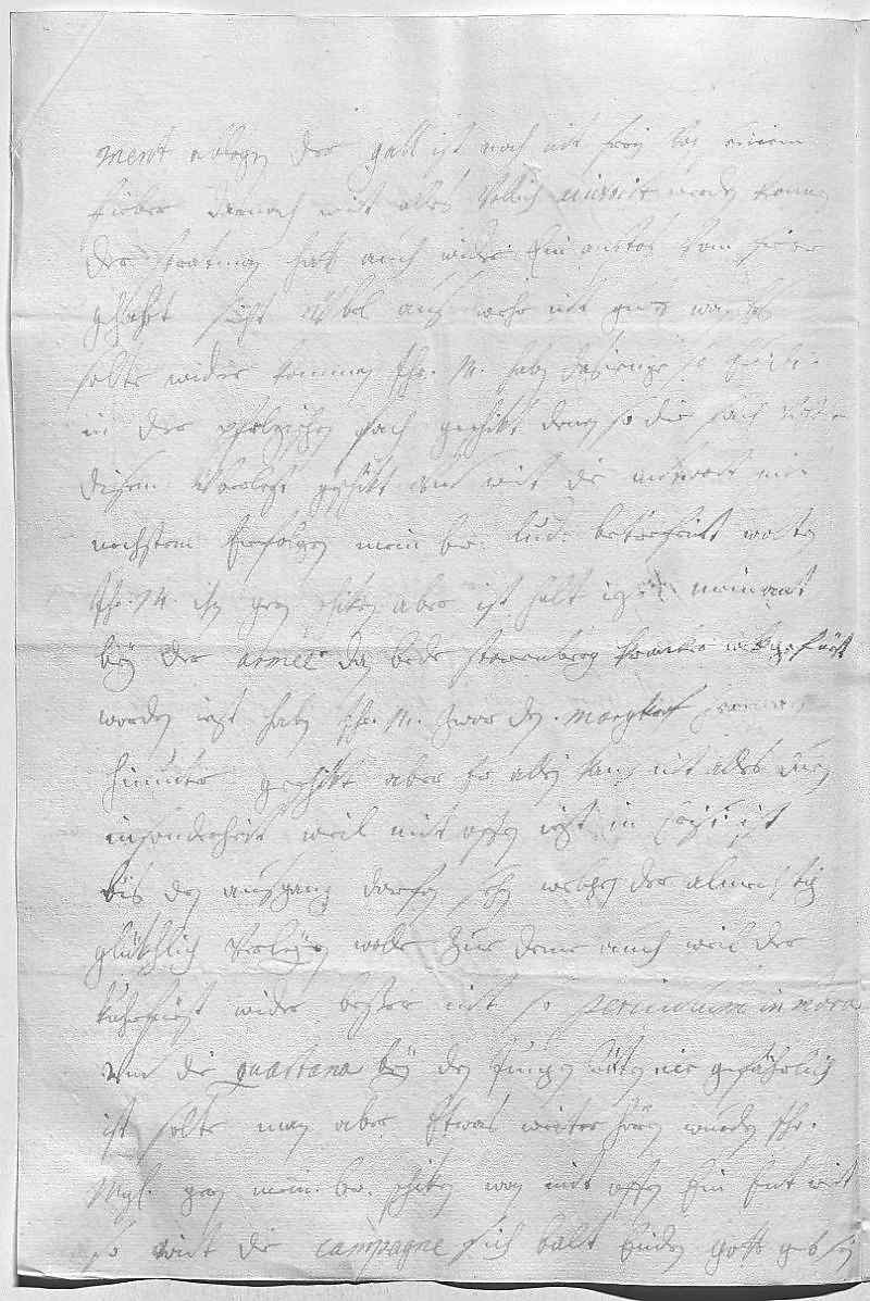 0019ment ablegen. Der Gall ist noch nit frey von seinem 0020fieber, darnach wirt alles vollich aiustirt werden konnen. 0021Der Stratman hatt auch wider ein anstos vom fieber 0022gehabt, siht übel aus, wehr nit gutt, wan es 0023solte wider kommen. Ihr Mayestät haben dasienige, so ewer Durchlaucht 0024in der pfelzischen sach geschikt, denen, so die sach vohr 0025disem überlegt, geschikt vnd wirt die antwort mit 0026nechstem erfolgen. Mein bruder Ludwig betrefent, wolten 0027ihr Mayestät ihn gern schiken, aber ist halt jezt niemant 0028bey der armeé, dan bede Starenberg kranker wekgefürt 0029worden. Izt haben ihr Mayestät zwar den Margkraf Herman 0030hinunter geschikt, aber er allein kans nit alles duen, 0031insonderheit weil mit Offen iezt in crisi ist. 0032Bis den ausgang darfon sehen, welchen der almechtig 0033glükhlich verleyen wolle, zue deme auch, weil der 0034Kuhrfürst wider beßer, nit so periculum in mora 0035vnd die quartana bey den jungen leüten nie gefährlich 0036ist, wird er bleiben, solte man aber etwas weiter hören, wurden ihr 0037Mayestät gern mein bruder schiken. Wan mit Offen ein ent wirt, 0038so wirt die campagne sich balt enden, gott geb sein