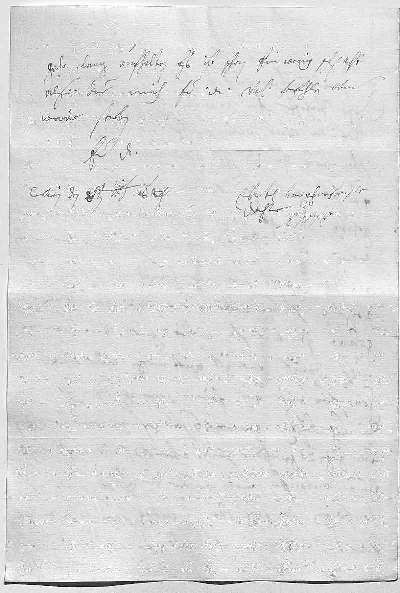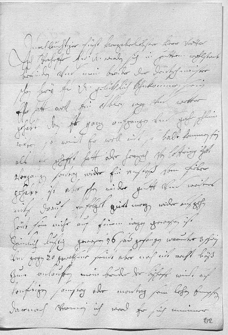 0001Durchleüchtiger Fürst, herzallerliebster herr vatter 0002Ich verhoffe, ewer Durchlaucht werden sich in guettem wohlstant 0003befnden vnd mein bruder, der Deütschmeister, 0004schon bey ewer Durchlaucht gelükhlich ahnkommen sein. 0005Ehr hatt woll ein vblen weg vnd wetter 0006gehabt, dan es ganz aufgangen vnd gahr schlim 0007reiten, so wirt er woll nit so balt kommen sein 0008als er gehofft hatt. Der Herzoch von Lottring hat 0009vergangen sontag wider ein anstoß vom fieber 0010gehabt, ist aber schon wider gutt vnd weiters 0011niks drauf erfolget, wirt morgen wider ausgehen. 0012Heüt sein mihr auf einem iagen gewesen, ist 0013zimlich lustig gewesen, haben 56 saw gefangen, warunter 3 schwein 0014vnd gegen 20 gewaksene, seint aber noch nit recht böß 0015zum anlauffen. Mein bruder, der Bischoff, wirt auf 0016konftigen samstag oder montag sein lehen empfangen, 0017darnach, vermein ich, werd er sich nimmer