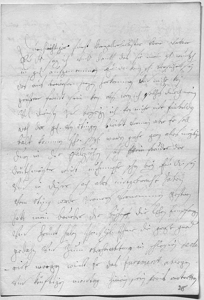 0001Durchleüchtiger Fürst, herzallerliebster herr vatter 0002Ewer Durchlaucht sag ich vnterdehnigsten dankh, das sie mein gehorsamen wuntsch 0003in gnaden aufgenommen, ewer Durchlaucht konen gehorsamst versichert sein, 0004das aus trewesten herzen herkommen vnd mihr kein 0005größere freüdt sein kan, als wan ich solches durch mein 0006vnterdehnigste diensten zue bezeigen. Ich kan mihr nit einbilden, 0007woh der Grav von Ötingen bleibt, vermein aber, er soll 0008balt kommen. Ihr Mayestät werden gahr gern alles möglige 0009duen in der pfalzischen sach. Mein bruder, der 0010Deütschmeister, wirt nuhnmehr schon bey ewer Durchlaucht sein 0011vnd in diser sach alles mitgebracht haben, 0012vom Öting werde verners vernemmen. Gestren 0013hatt mein brueder, der Bischoff, die lehen empfangen, 0014vnd heünt haben ihr Mayestät ihme die große gnad 0015gedahn vnd ihn zum Oberhaubtman in Schlesien decla- 0016rirt. Morgen wirt er das jurament ablegen 0017vnd könftigen montag hinein sein reis antretten.