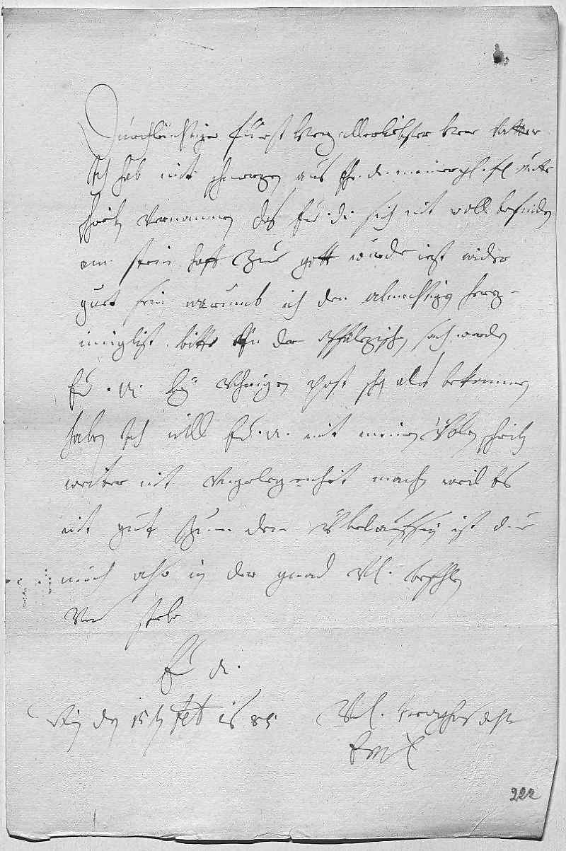 0001Durchleüchtiger Fürst, herzallerliebster herr vatter 0002Ich hab mit schmerzen aus ihr Durchlaucht, meiner geliebsten fraw mutter, 0003schreiben vernommen, das ewer Durchlaucht sich nit woll befinden 0004am stein, hoff zue gott, wurde iezt wider 0005guet sein, warumb ich den almechtigen herz- 0006inniglist bitte. In der pfälzischen sach werden 0007ewer Durchlaucht bey vohriger post schon ales bekommen 0008haben. Ich will ewer Durchlaucht mit meinen üblen schreiben 0009weiter nit vngelegenenheit machen, weil es 0010nit guett zum dem übelaufsein ist. Due 0011mich also in der gnad vnterdehnigst befehlen 0012vnd sterbe 0013ewer Durchlaucht 0014vnterdehnigst trewgehorsamste dochter 0015EMT 0016Wien den 15ten februarij 1685