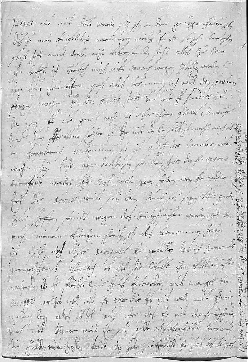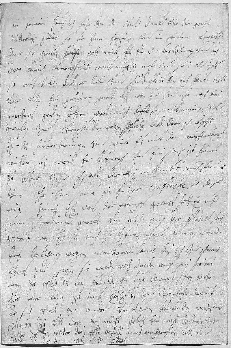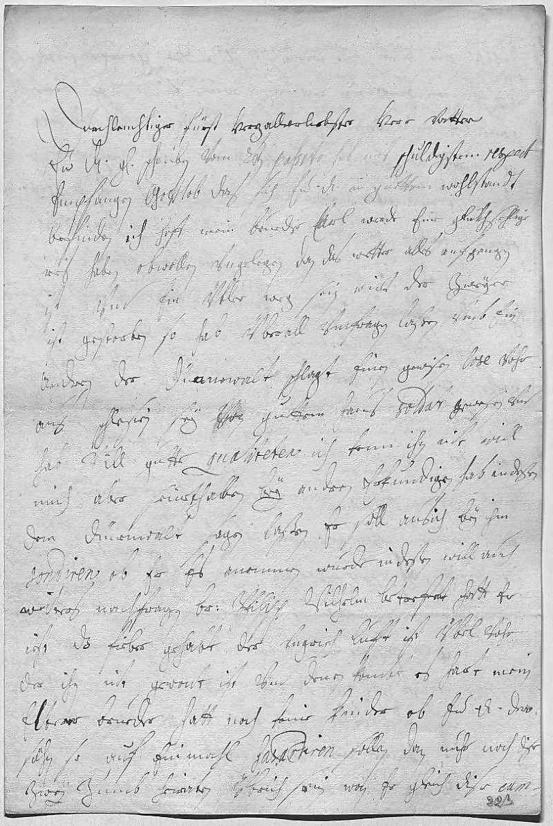 0001Durchleüchtiger Fürst, herzallerliebster herr vatter 0002Ewer Durchlaucht gnädiges schreiben vom 26ten passato hab mit schuldigstem respect 0003empfangen, gottlob, das sich ewer Durchlaucht in guettem wohlstandt 0004befinden. Ich hoff, mein brueder Carl werde eine glükhsehlige 0005reis haben, obwollen vngelegen, dan das wetter alles aufgangen 0006ist vnd ein übler weg sein wirt. Der Zweyer 0007ist gestorben, so hab überall vmfragen laßen vmb ein 0008andren, der Dünnewalt schlagt einen gewisen Cose vohr 0009aus Schlesien, sey von guettem haus, soldat gewesen vnd 0010hab vill gutte qualiteten. Ich kenn ihn nit, will 0011mich aber seinethalben bey andren erkundigen, hab indeßen 0012dem Dünewalt sagen laßen, er soll ausich bey ihm 0013sondiren, ob er es anemmen wurde, indeßen will auch 0014weiters nachfragen. Bruder Pfilipp Wilhelm betreffent, hatt er 0015izt das fieber gehabt, der vngrisch luft ist übel vohr 0016der ihn nit gewont ist vnd denen kombt es hart. Mein 0017elterer brueder hatt noch keine kinder, so ist zu überlegen, ob ewer Durchlaucht dero 0018söhn so auf einmahl hasardiren sollen, dan nuhr noch dise 0019zwey zumb heiraten übrich sein. Wan er gleich dise cam-