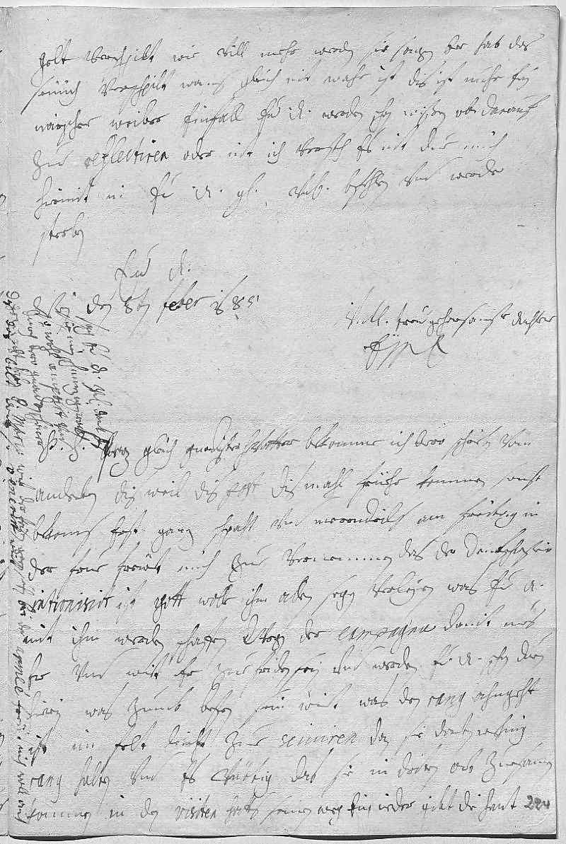 0041gelt verschpilt, wie vill mehr werden sie sagen, er hab das 0042seinich verschpilt, wans gleich nit wahr ist. Dis ist nuhr ein 0043narischer weiber einfall, ewer Durchlaucht werden schon wißen, ob darauf 0044zue reflectiren oder nit, ich versteh es nit. Due mich 0045hiermit in ewer Durchlaucht gnade vnterdehnigst befehlen vnd werde 0046sterben 0047ewer Durchlaucht 0048vnterdehnigst trew gehorsamste dochter 0049EMT 0050Wien den 8ten feber 168500511Sag ewer Durchlaucht vnterdehnigsten dank, das 0052sie mein schmuzigen rockh 0053so wohl acceptirt vnd 0054durch dero gnade schöner 0055gemacht haben. Pater Marco wirt der Keiser gern sehen bei der armeé. Freüt mich woll auch 0056das das bilt dorten so venerirt wirt. 0057Postscriptum Jez gleich, gnadister herr vatter, bekomme ich dero schreiben vom 0058anderten dis, weil dis post dis mahl frühr kommen, sonst 0059bekoms erst ganz schpaht vnd merendeils am freitag in 0060der frue. Frewet mich zu vernemmen, das der Deutschmeister 0061intronisirt ist, gott wolle ihm allen segen verleyen, was ewer Durchlaucht 0062mit ihm werden schaffen. Wegen der campagna, damit mues 0063er vnd wirt er zue friden sein, vnd werden ewer Durchlaucht schon duen 0064hirin, was zumb besten sein wirt. Was den rang ahngeht, 0065ist im felt leicht zue sciniren, dan sie dorten wehnig 0066rang halten vnd es vnötig, das sie in driten ort zuesamen 0067kommen. In den visiten hatts seinen weg, ein ieder gibt die hant