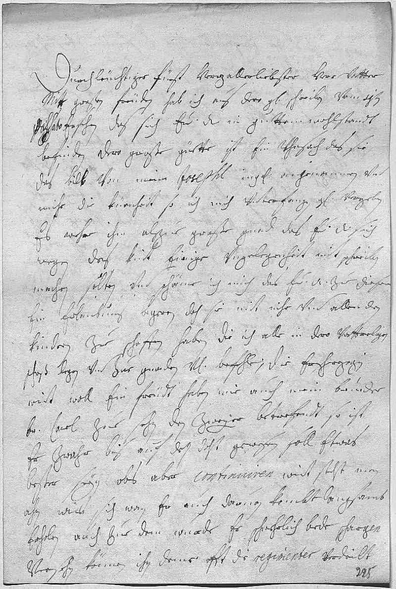 0001Durchleüchtiger Fürst, herz allerliebster herr vatter 0002Mitt großen freüden hab ich aus dero gnädigem schreiben vom 19ten0003passato ersehen, das sich ewer Durchlaucht in guettem wohlstandt 0004befinden. Dero große güette ist ein vhrsach, das sie 0005das bilt von meim Josephl ingnaden angenommen vnd 0006mihr die küenheit, so ich mich vnterfangen, gnädigst vergeben. 0007Es wehre ihm alzue große gnad, das ewer Durchlaucht sich 0008wegen des kint einige vngelegenheit mit schreiben 0009machen solten, vnd schäme ich mich, das ewer Durchlaucht zue diesem 0010ein erlaubnus begeren, doh sie mit mihr vnd allen den 0011kindern zue schaffen haben, die ich alle in dero vatterligen 0012schoß legen vnd zue gnaden vnterdehnigst befehle. Die Erzherzogin 0013wirt woll ein freüdt haben, wie auch mein brueder, 0014bruder Carl zue sehn. Den Zweyer betrefendt, so ist 0015er zwahr bis auf den doht gewesen, soll aber etwas 0016beßer seyn, obs aber continiuiren wirt, steht man 0017ahn, wirt sich, wan er auch daruon kombt, langsamb 0018erholen, auch zue dem wurde er schwehrlich bede schargen 0019versehen können, ihn deme offt die regimenter verdeilt