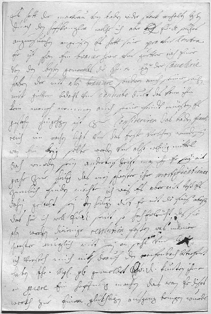 0040halten, das er wegen seiner einrichtung vnd der pfälzischen 0041sach dis iahr nit abkommen können, steht es bey dero 0042gnädigstem blieben, förchte, es werde mit diser campagne 0043die krig noch kein ent haben, das er aufswehnigste 0044nachgehns den krieg continuiren möge. Das Frankreich 0045des Sikingen schloß wech genommen, ist freilich gahr ein schlimme 0046sach, ich hab mich aber ganz niks drüber verwundert, dan ich 0047hab allezeit glaubt, das er weder frid noch stilstant halten 0048werde anderst, als darneben zue nemmen, was ihm gelegen 0049ist. Gott behüet den Cuhrfürst, es wurden greülige hendel geben, 0050dan ich hör, der hiesige franzos hatt schon sich verlauten laßen, 0051man kön dem König nit verüblen, das er sich bezahlter machen 0052deßen, was der Madame gehörich. Es wurd ein newer krieg 0053im Reich werden, wan mihr nuhr erst mit dem türken 0054loß wehren, gott wirt alles machen wis recht ist. Das ewer 0055Durchlaucht bruder Pfilipp Wilhelm mit dem Carl ins felt schiken 0056wollen, höre ich, er hab das fieber vnd der vngrische 0057luft ist gahr nit guett darzue vnd er ist noch 0058iung, sonst wehr es ihm schon guett. Wegen Pohlen hab ich 0059wehnig hoffnung wegen der franzosen machination. Portugal 0060wirt iezt balt müeßen ein endt machen, der Cardinal 0061hatt wider einwehnig hoffnung gezeigt, aber mehr auf mein 0062brudern, dan deils meinen, der König werd gahr nit heirahten.