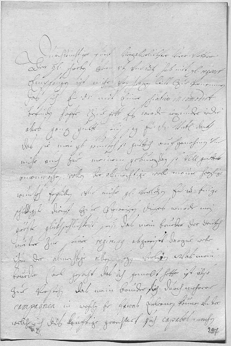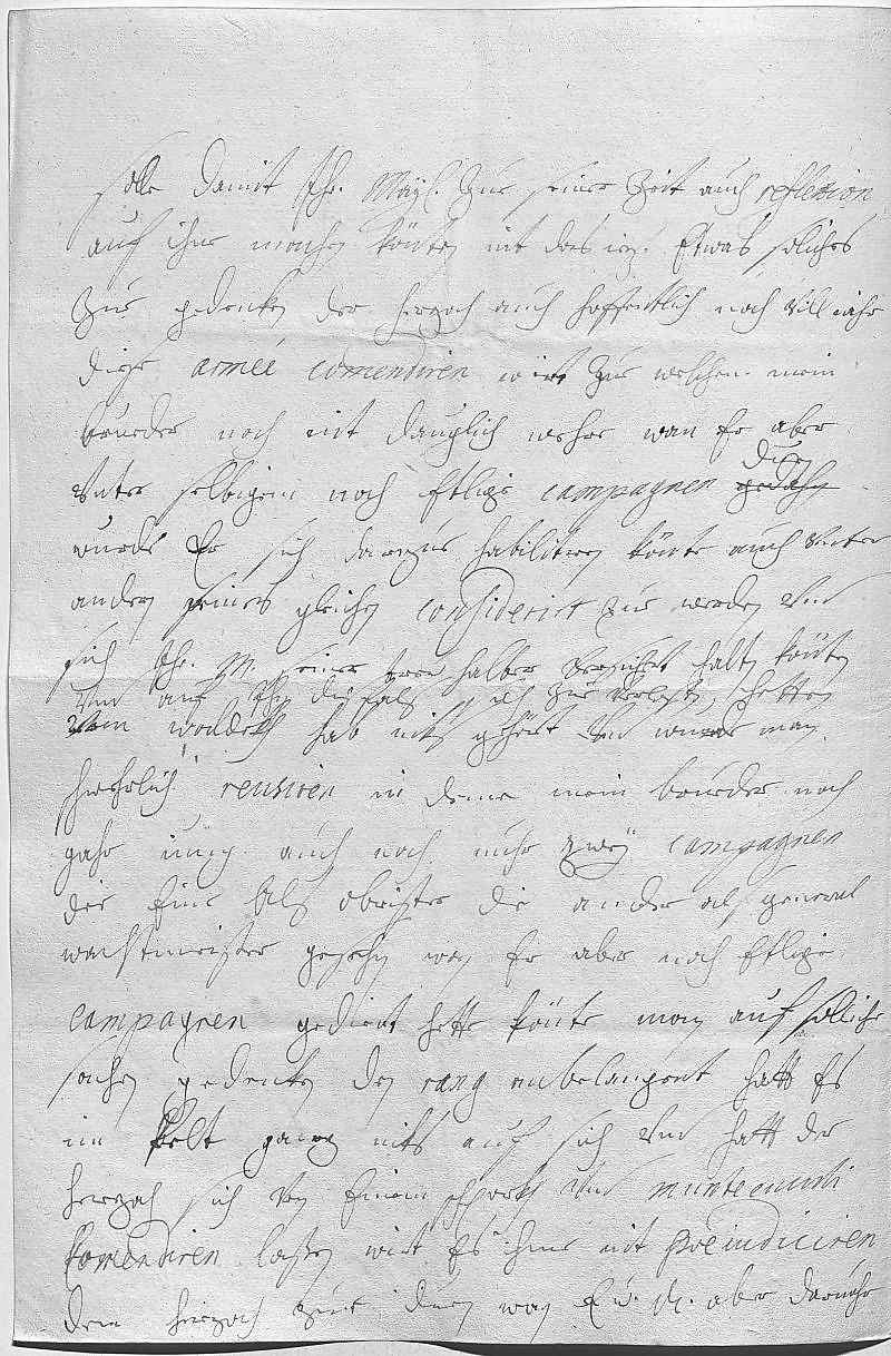 0001Durchleüchtiger Fürst, herzallerliebster herr vatter 0002Dero gnädige schreiben vom 5ten vnd 12ten hab mit gehorsamsten respect 0003empfangen. Ist mihr von herzen leidt zue vernemmen, 0004das sich ewer Durchlaucht mit einer schiatica incomodirt 0005befinden, hoffe zue gott, es werde iezunder wider 0006alles ganz guett sein. Sag ewer Durchlaucht vnterdehnigsten dankh, 0007das sie mein gehorsame wuntsch so güettich auf genohmen vnd 0008mihr auch zue meinem geburzdag so vill guttes 0009anwüntschen wollen, der almächtige wolle meine herzlige 0010wuntsch erfüllen vnd mihr gnade verleyen, ewer Durchlaucht einige 0011schuldigste dienst zue erweisen, dises wurde mein 0012gröste glükhsehlichkeit sein. Das mein brueder, der Deütsch 0013Meister, zue seiner regirung abgereiset, darzue wolle 0014ihm der almechtige allen segen verleyen. Was mein 0015brueder Carl gesacht, das ich gemelt hette, ist also 0016zue verstehen, das mein brueder sich durch mehrere 0017campagnen, in wehchen er etwas erlernen könne, vnter 0018welche ich dis könftige gerechnet, sich capabel machen