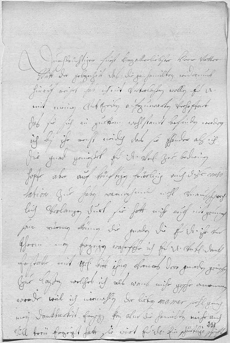 0001Durchleüchtiger Fürst, herzallerliebster herr vatter 0002Mitt der gelegenheit, das die Grävin Hamilton widerumb 0003hinauf reiset, hab ich nit vnterlaßen wollen, ewer Durchlaucht 0004mit meinen vnterdehnigsten zeilen aufzuewarten, verhoffent, 0005das sie sich in guettem wohlstandt befinden werden. 0006Ich bin ihr recht neidich, das sie ehender als ich 0007die gnad genießet, ewer Durchlaucht vnterdehnigst zue bedienen, 0008hoffe aber auf könftigen früeling auch dise conso- 0009lation zue haben, warnach mich wohl vnauschprech- 0010lich verlangen duet. Sie hatt mihr auch nit genuech- 0011sam rüemen können die gnaden, die ewer Durchlaucht ihr vnd 0012ihrem man erzeigen, wahrfohr ich ewer Durchlaucht vnterdehnigsten dankh 0013erstatte mit gehorsamster bitt, ihnen verners dero gnaden geniesen 0014zue laßen, welches ich als wans mihr gesche annemmen 0015werde, weil ich niemahlen der lieben Mamer sehligen gnuch 0016mein dankbarkeit erzeigen kan vnd die Hamilton mihr auch 0017vill treü erzeiget hatt. Sie wirt ewer Durchlaucht ein schäntlige schrift