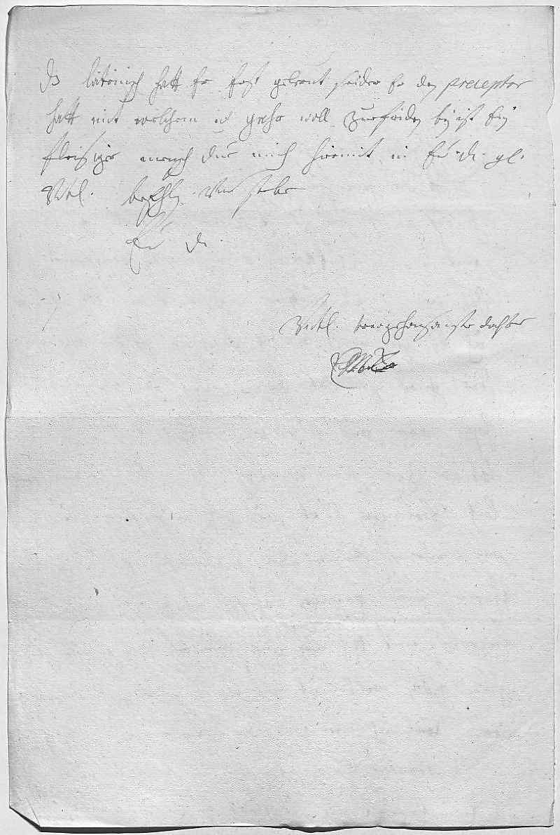 0018übermitteln, 1 das lateinisch hatt er erst gelernt, seider er den preceptor 0019hatt, mit welchem ich gahr woll zuefriden bin, ist ein 0020fleisiger mensch. Due mich hiermit in ewer Durchlaucht gnade 0021vnterdehnigst befehlen vnd sterbe 0022ewer Durchlaucht 0023vnterdehnigst trewgehorsamste dochter 0024EMT