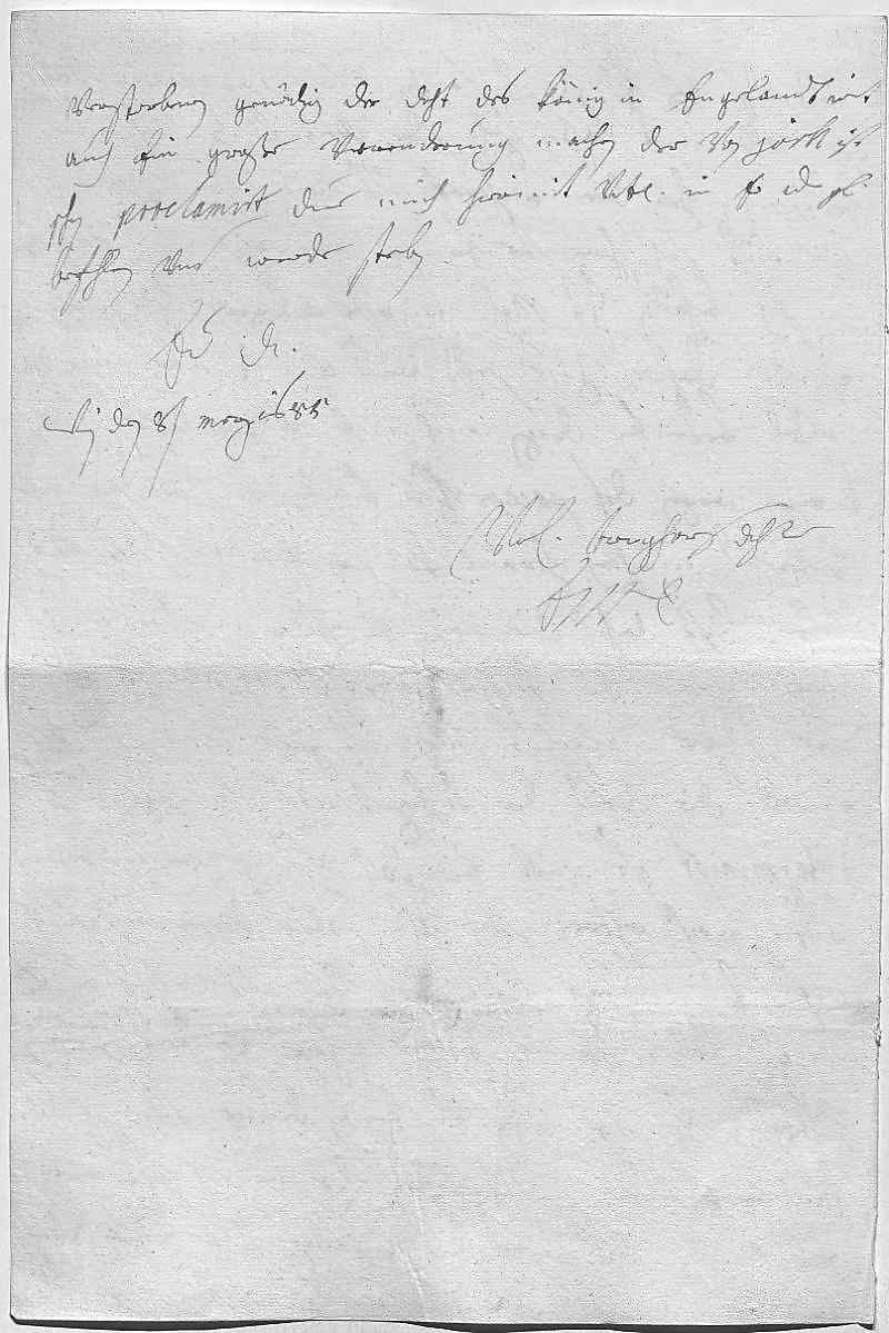 0108dem verstorbenen genädig. Der doht des König in Engelandt wirt 0109auch ein große verenderung machen, der von Jork ist 0110schon proclamirt. Due mich hiermit vnterdehnigst in ewer Durchlaucht gnade 0111befehlen vnd werde sterben 0112ewer Durchlaucht 0113vnterdehnigste trewgehorsamste dochter 0114EMT 0115Wien den 8ten merz 1685