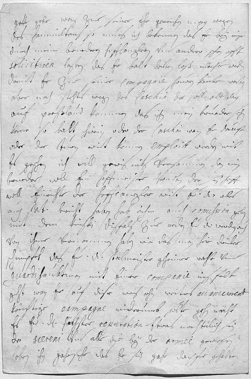 0065gott gebe, was zue seiner ehr gereichen mag. Wegen 0066des Hammiltons, so mues ich bekennen, das er bey mihr 0067durch mein bruederen, Hoffkanzlern vnd andere schon offt 0068solicitiren laßen, das er balt dorten loß möchte werden, 0069damit er zue seiner compagnie schawen könte. Warten 0070aber noch stehts wegen des Caschin, der soll alle dach 0071auf Preßlaw kommen, das ihn mein brueder sehn 0072köne. So balt hierin oder der Caschin, wan er daugt, 0073oder der Turn wirt können emploirt werden, wirt 0074es geschen. Ich will gewis niks versaumen, dan mein 0075brueder woll ein hoffmeister vonöten, der sein hoff 0076woll einrichte. Der Hoffcanzler wirt ewer Durchlaucht alles 0077auch vnterdehnigst bericht haben, hab ihm auch comission geben, 0078mit dem Kinski disfals zue reden. Ewer Durchlaucht werden auch 0079von ihme vernommen haben, wie das man hier drüber 0080schimpfet, das ewer Durchlaucht Stalmeister, Geheimer Raht vnd 0081Guardihaubtman mit einer companie ins felt 0082geht. Wan er auf dise weis ohn weiters auancement 0083könftige campagne widerumb solte gehn, möcht 0084es ewer Durchlaucht höchster reputation etwas nachteilich sein. 0085Der Scereni vnd alle, die bey der armeé gewesen, 0086loben ihn gahrsehr, das er sich gahr dapfer gehalten,