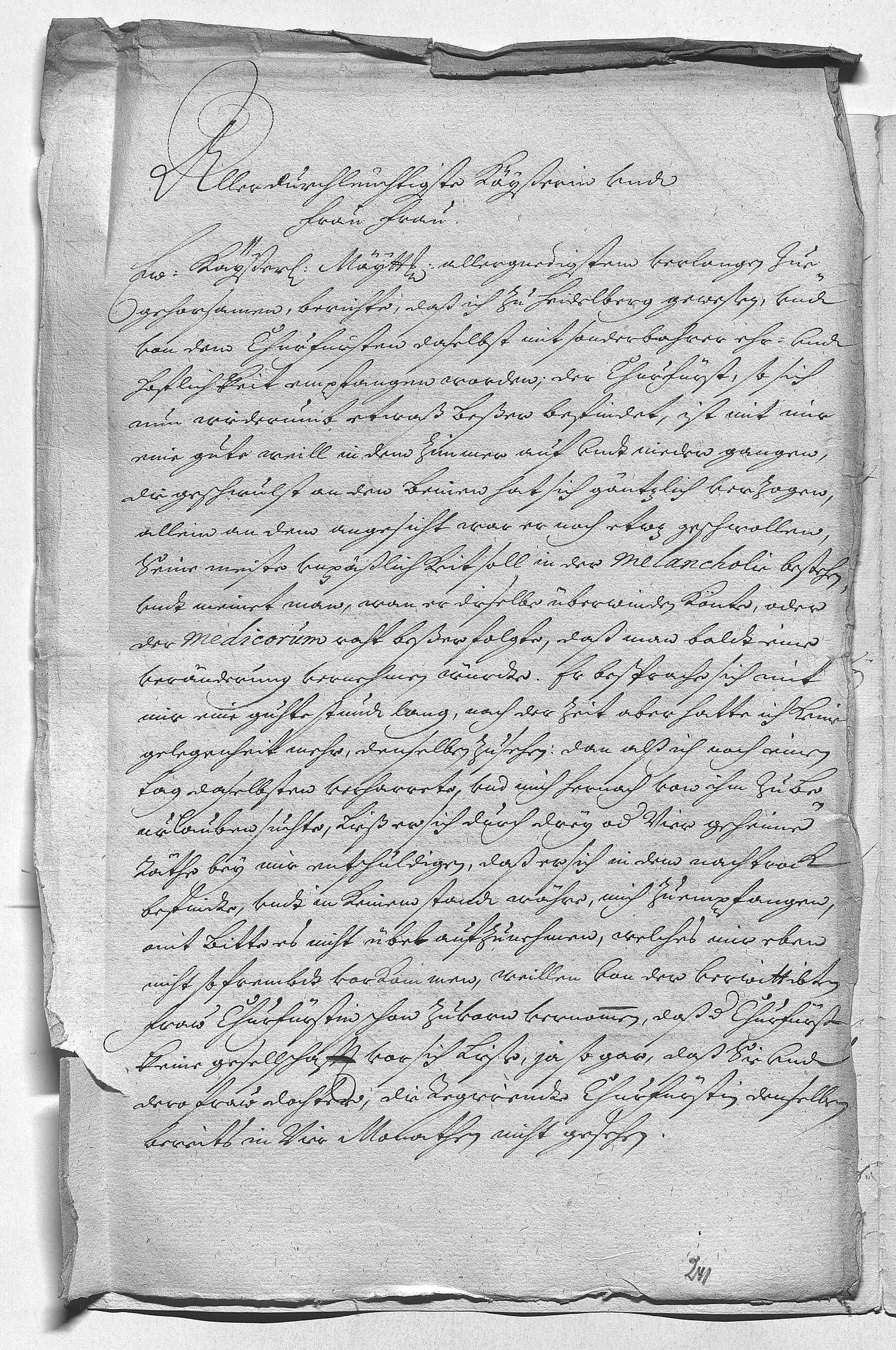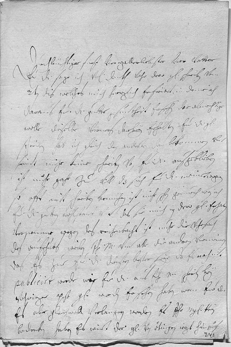 0001Durchleüchtiger Fürst, herzallerliebster herr vatter 0002Ewer Durchlaucht sage ich vnterdehnigsten dankh vohr dero gnädiges schreiben vom 00032ten dis, welches mich herzlich erfrewet, in deme ich 0004daraus ewer Durchlaucht guette gesuntheit ersehn, der almechtige 0005wolle dieselbe verners darbey erhalten. Ewer Durchlaucht gnädiges 0006schreiben hab ich gleich den anderten dag bekommen vnd 0007seindt mihr keine schreiben von ewer Durchlaucht ausgeblieben. 0008Ist nuhr gahr zu vill, das sich ewer Durchlaucht meinetwegen 0009so offt mit schreiben bemühen, ist mihr schon genuech, wan ich 0010ewer Durchlaucht gutten wohlstant vndt das sie mich in dero gnade erhalten 0011vernemme. Wegen des Reichenbachs ist nuhr die vhrsach 0012des aufschubs, weilen ihr Mayestät vnd alle die andren vermeinen, 0013das es zue ewer Durchlaucht diensten beßer seye, das es noch nit 0014publicirt werde, wie ewer Durchlaucht aus ihr Mayestät schreiben bey 0015vohriger post gnädig werden ersehen haben. Wan ewer Durchlaucht 0016es aber gleichwoll verlangen, werden es ihr Mayestät kein 0017bedenken haben. Es wirt der Grav von Ötingen iezt hinauf