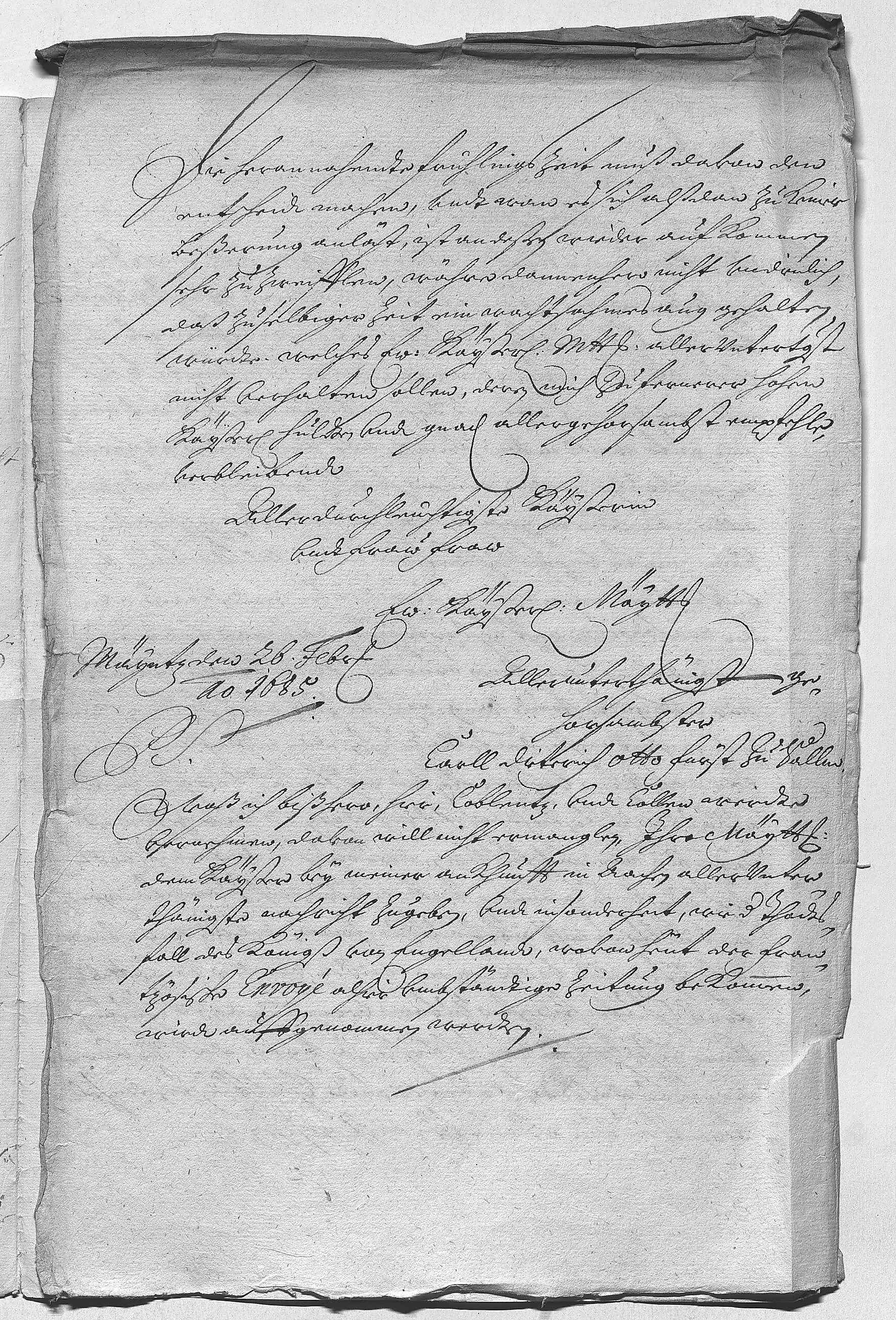 0036lebens mittel bekommen, müßen sie es verlaßen, 0037gott gebe, das deme also sey. Der Heisler halt sich 0038woll. Due mich hiermit in ewer Durchlaucht gnade vnterdehnigst befehlen 0039vnd werde sterben 0040ewer Durchlaucht 0041vnterdehnigste trewgehorsamste dochter 0042EMT 0043Wien den 25ten merz 16850044Schike ewer Durchlaucht auch ein brief von Fürst von Salm, 0045so er mihr von Heidelberg geschriben, waraus ewer Durchlaucht 0046des Cührfürsten standt vernemmen werden.