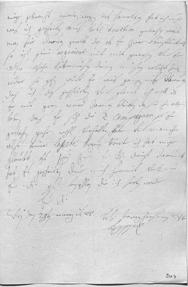 0039möge gebracht werden. Wegen des Hamilton hab ich nuhr, 0040was ich geschrieben, aus vnterdehnigster deuotion gedahn, weil 0041man hier daruon gerett, dan ob er zwar Obristleütenant, 0042so ist sein regiment nit mit gewesen vnd er 0043also vohr Rittermeister dienen müßen, welches heier 0044wider so gehn wirt. Er weis ganz niks daruon, 0045das ich das geschrieben vnd glaub ich woll, das 0046er nit gern wurd daruon bleiben, dan sie ihn alle 0047loben, das er sich die 2 campagnen, so er 0048gedahn, gahr wohl verhalten habe vnd man ihn 0049also keiner lasceté bezeigen könte. Ich hab nuhr 0050glaubt, es sey zue ewer Durchlaucht dienst, darumb 0051hab es geschrieben. Due mich hermit vnterdehnigst in 0052ewer Durchlaucht gnade befehlen, die ich sterben werde 0053ewer Durchlaucht 0054vnterdehnigste trewgehorsamst dochter 0055EMT 0056Wien den 29ten merz 1685
