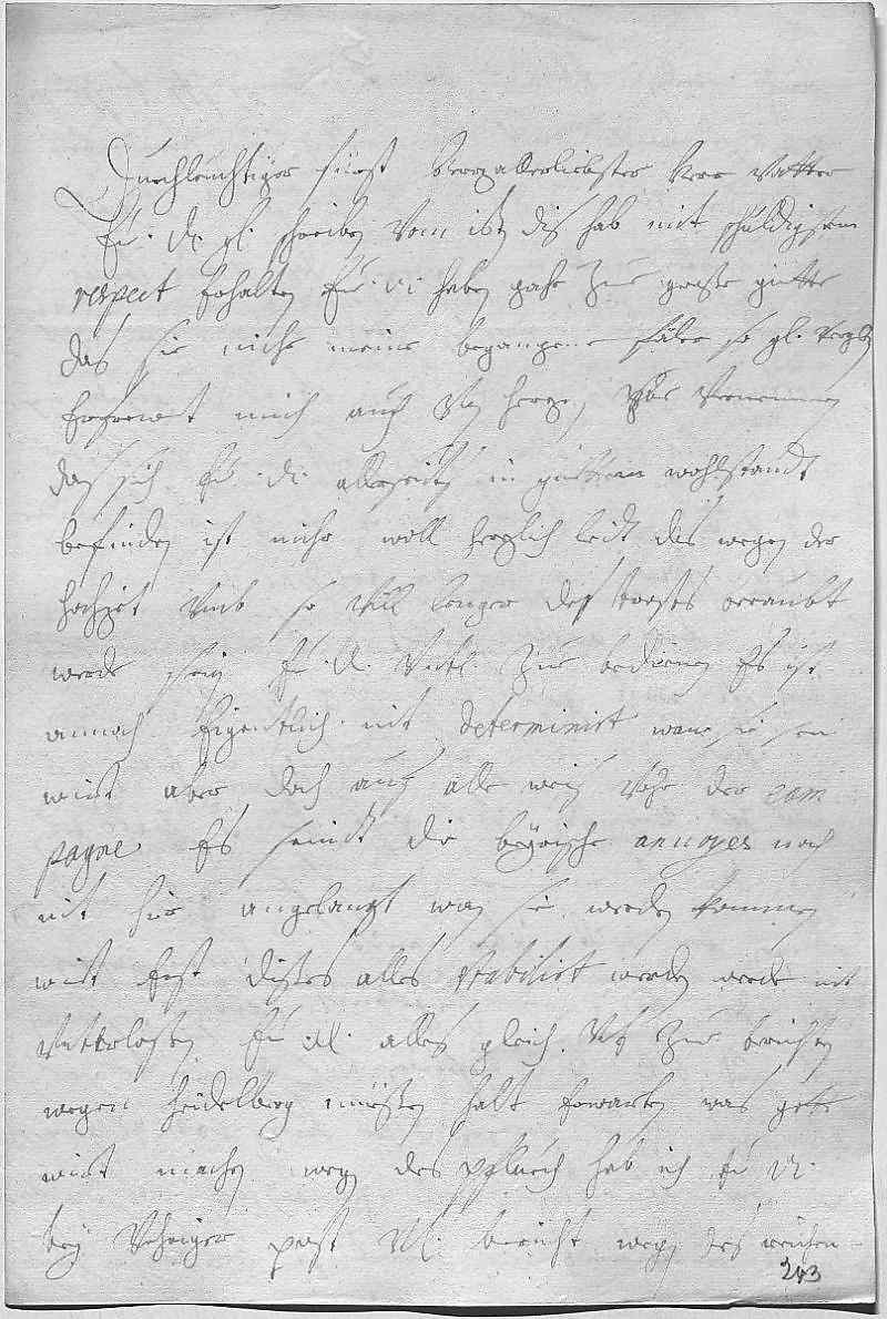 0001Durchleüchtiger Fürst herzallerliebster herr vatter 0002Ewer Durchlaucht gnädiges schreiben vom 16ten dis hab mit schuldigstem 0003respect erhalten. Ewer Durchlaucht haben gahr zue große gütte, 0004das sie mihr meine begangene fäler so gnädigst vergeben. 0005Erfrewet mich auch von herzen zue vernemmen, 0006das sich ewer Durchlaucht allerseits in guettem wohlstandt 0007befinden. Ist mihr woll herzlich leidt, das wegen der 0008hochzeit vmb so vill lenger des trosts beraubt 0009werde sein, ewer Durchlaucht vnterdehnigst zue bedienen. Es ist 0010annoch eigentlich nit determinirt, wan sie sein 0011wirt, aber doch auf alle weis vohr der cam- 0012pagne. Es seint die beyrische anuoyes noch 0013nit hier angelangt, wan sie werden kommen, 0014wirt erst dißes alles stabilirt werden, werde nit 0015vnterlaßen ewer Durchlaucht alles gleich vnterdehnigst zue berichten. 0016Wegen Heidelberg müeßen halt erwarten, was gott 0017wirt machen. Wegen des Pfluech hab ich ewer Durchlaucht 0018bey vohriger post vnterdehnigst bericht, wegen des Reichen-