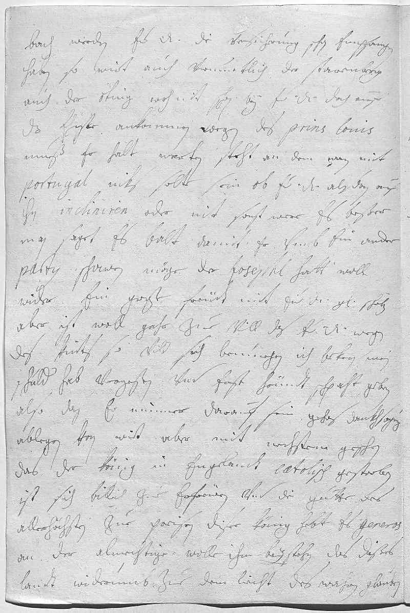 0019bach werden ewer Durchlaucht die versicherung schon empfangen 0020haben. So wirt auch vermuetlich der Starenberg und0021auch der Öting woh nit schon bey ewer Durchlaucht, doch auf 0022das ehiste ankommen. Wegen des Prins Louis, 0023mueß er halt warten, steht an dem, wan mit 0024Portugal niks solte sein, ob ewer Durchlaucht alsdan auf 0025ihn incliniren oder nit. Sonst were es beßer, 0026man saget es balt, damit er vmb ein ander 0027partij schawen möge. Der Josephl hatt woll 0028wider ein große freüdt mit ewer Durchlaucht gnädigem schreiben, 0029aber ist woll gahr zue vill, das ewer Durchlaucht wegen 0030des kints so vill sich bemüehen. Ich beken mein 0031schuld, hab vergeßen vnd es erst heündt schpaht ihm geben, 0032also das er nimmer darauf sein gehorsamste dankhsagung 0033ablegen kan, wirt aber mit nechstem geschen. 0034Das der König in Engelandt catolisch gestorben, 0035ist sich billich zue erfrewen vnd die gütte des 0036allerhöchsten zue preisen. Diser König hebt es generos 0037an, der almechtige wolle ihm beystehn, das dißes 0038landt widerumb zue dem liecht des wahren glauben