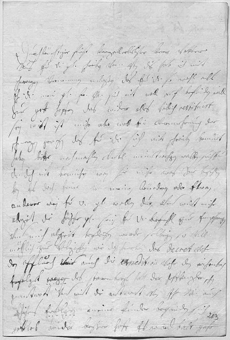0001Durchleüchtiger Fürst, herzallerliebster herr vatter 0002Aus ewer Durchlaucht gnädigem schreiben vom 4ten dis hab ich mit 0003schmerzen vernemmen müeßen, das ewer Durchlaucht so wohl als 0004ihr Durchlaucht, mein geliebste fraw mutter, sich nit woll auf befinden, will 0005zue gott hoffen, das wider alles völlich restituirt 0006sein wirt. Ist mihr aber woll ein vermehrung der 0007schmerzen gewesen, das ewer Durchlaucht sich mit schreiben bemüet 0008haben, bitte nochmahlen vnterdehnigst, meinetwehgen wollen sich ewer 0009Durchlaucht doch nit bemühen. Wan sie mihr was zue befehlen, 0010kan es doch einer von meinen brüedern oder etwan 0011anderer, wen ewer Durchlaucht gnädigst wollen, duen vnd wirt mihr 0012allezeit die höchste gnade sein, ewer Durchlaucht befehl zue empfangen 0013vnd mich alzeit befleisen werde, selbigen so vill 0014möglich zue volziehen. Wie dan hierbey das decret vohr 0015den Pfluech vnd auch die expedition vohr den Reichenbach 0016erfolget. 1Wegen des Starenbergs hatt der Hoffkanzler schon 0017geantwort vnd wirt die antwort von ihr Mayestät auch 0018ehistens erfolgen. Meine kinder befinden sich 0019gottlob wider beßer, hoff, es werd balt gahr