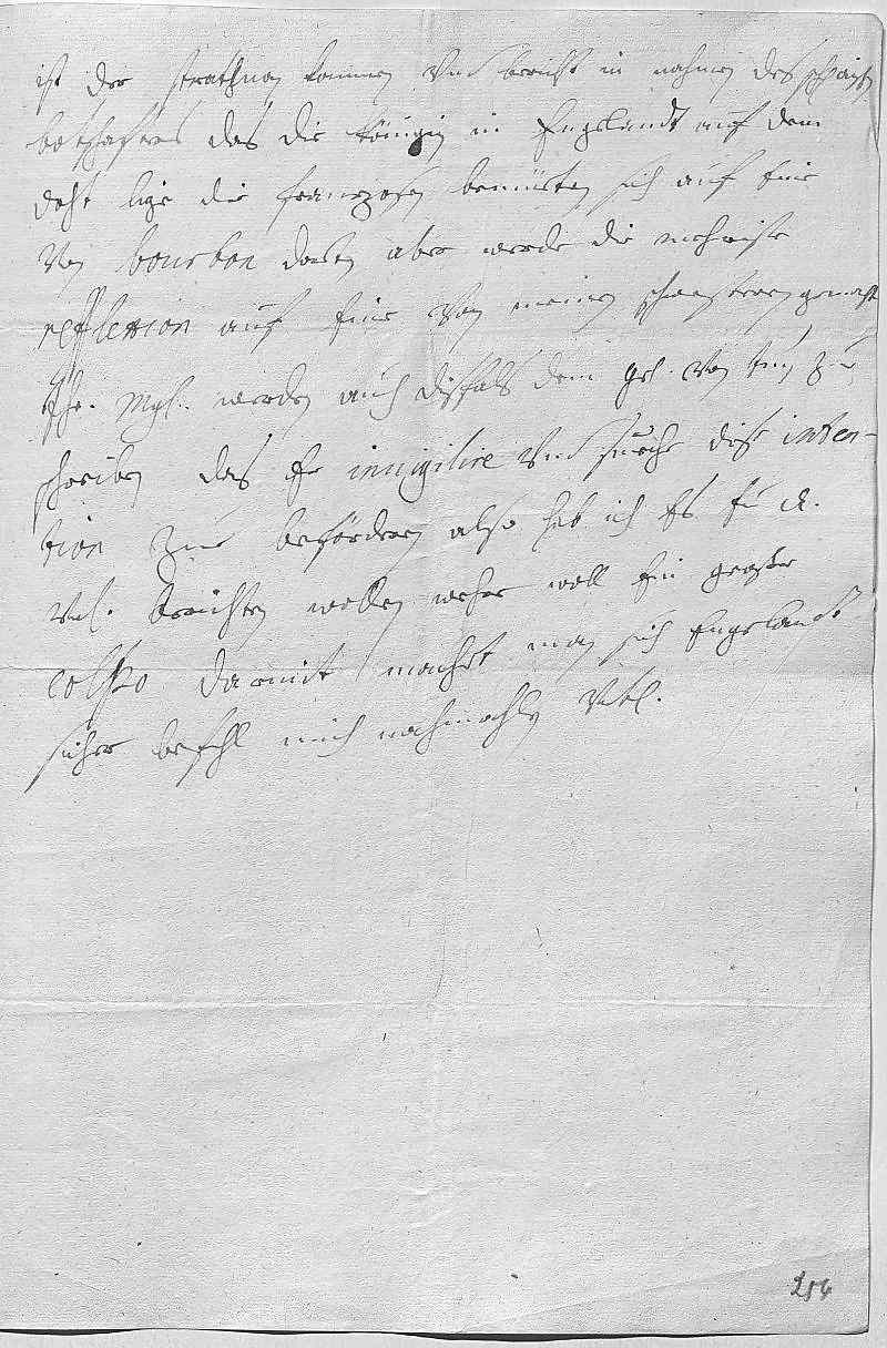 0042ist der Strathman kommen vnd bericht in nahmen des spanischen 0043Botschafters, das die Königin in Engelandt auf dem 0044doht lige. Die franzosen bemüeten sich auf eine 0045von Bourbon, dorten aber werde die mehriste 0046reflexion auf eine von meinen schwesteren gemacht. 0047Ihr Mayestät werden auch disfals dem Grav von Tun zue 0048schreiben, das er inuigilire vnd sueche dise inten- 0049tion zur beförderen. Also hab ich es ewer Durchlaucht 0050vnterdehnigst berichten wollen, wehre woll ein große 0051colpo, darmit machet man sich Engelandt 0052sicher. Befehl mich nochmahlen vnterdehnigst .
