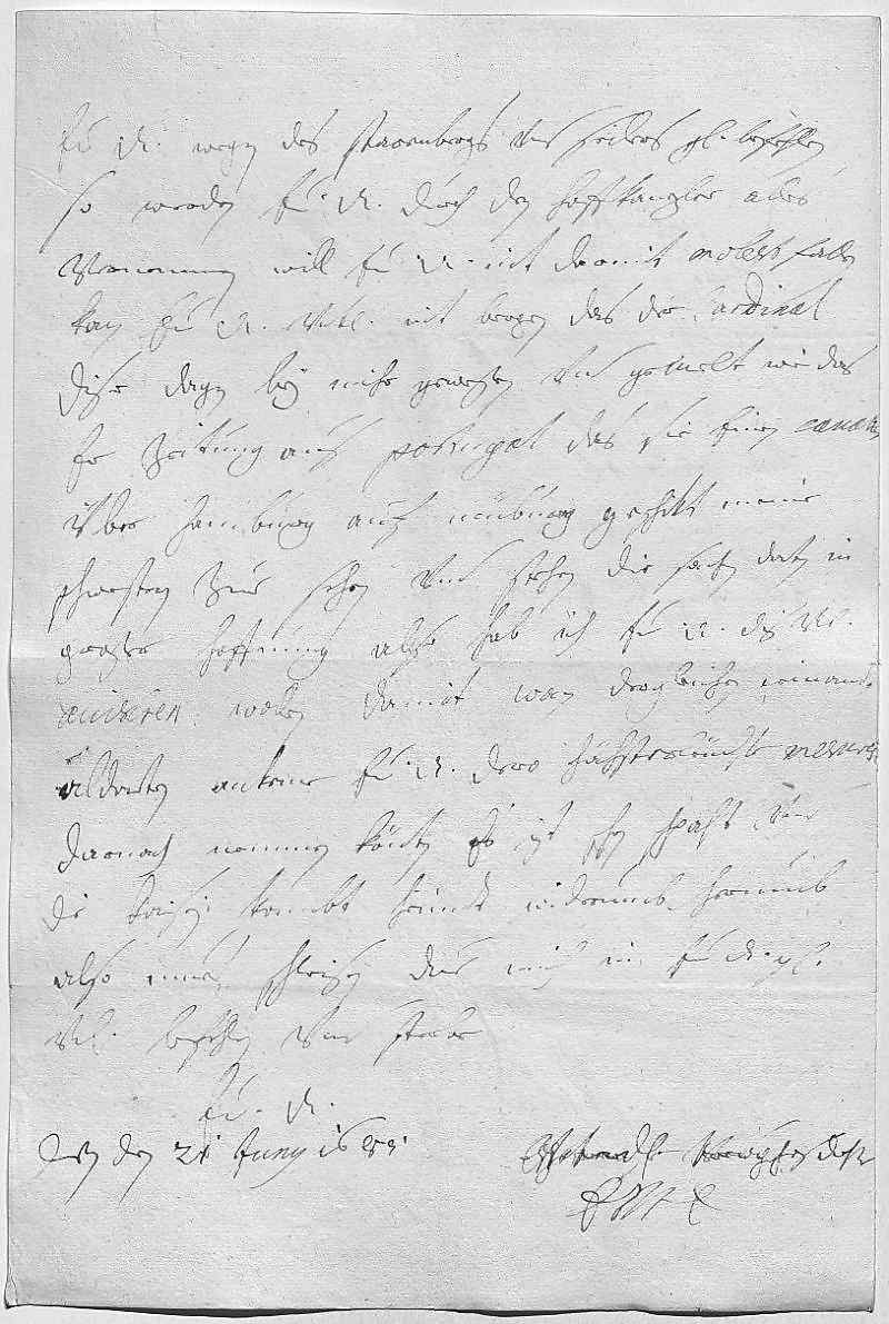0018ewer Durchlaucht wegen des Starenbergs vnd Seilers gnädigst befehlen, 0019so werden ewer Durchlaucht durch den Hoffkanzler alles 0020vernemmen, will ewer Durchlaucht nit darmit molest fallen. 0021Kann ewer Durchlaucht vnterdehnigst nit bergen, das der Cardinal 0022dise dagen bey mihr geweßen vnd gemelt, wie das 0023er zeitung aus Portugal, das sie einen caualir 0024über Hamburg auf Neüburg geschikt, meine 0025schwestern zue sehen, vnd stehen die sachen dorten in 0026großer hoffnung. Also hab ich ewer Durchlaucht dis vnterdehnigst 0027auisiren wollen, damit, wan dergleichen iemant 0028aldorten ankeme, ewer Durchlaucht dero höchsterleüchte mesuren 0029darnach nemmen könten. Es ist schon schpaht vnd 0030die Kaiserin kombt heindt widerumb herumb, 0031also mues schleisen. Due mich in ewer Durchlaucht gnade 0032vnterdehnigst befehlen vnd sterbe 0033ewer Durchlaucht 0034vnterdehnigste trewgehorsamste dochter 0035EMT 0036Wien den 21 junij 1685