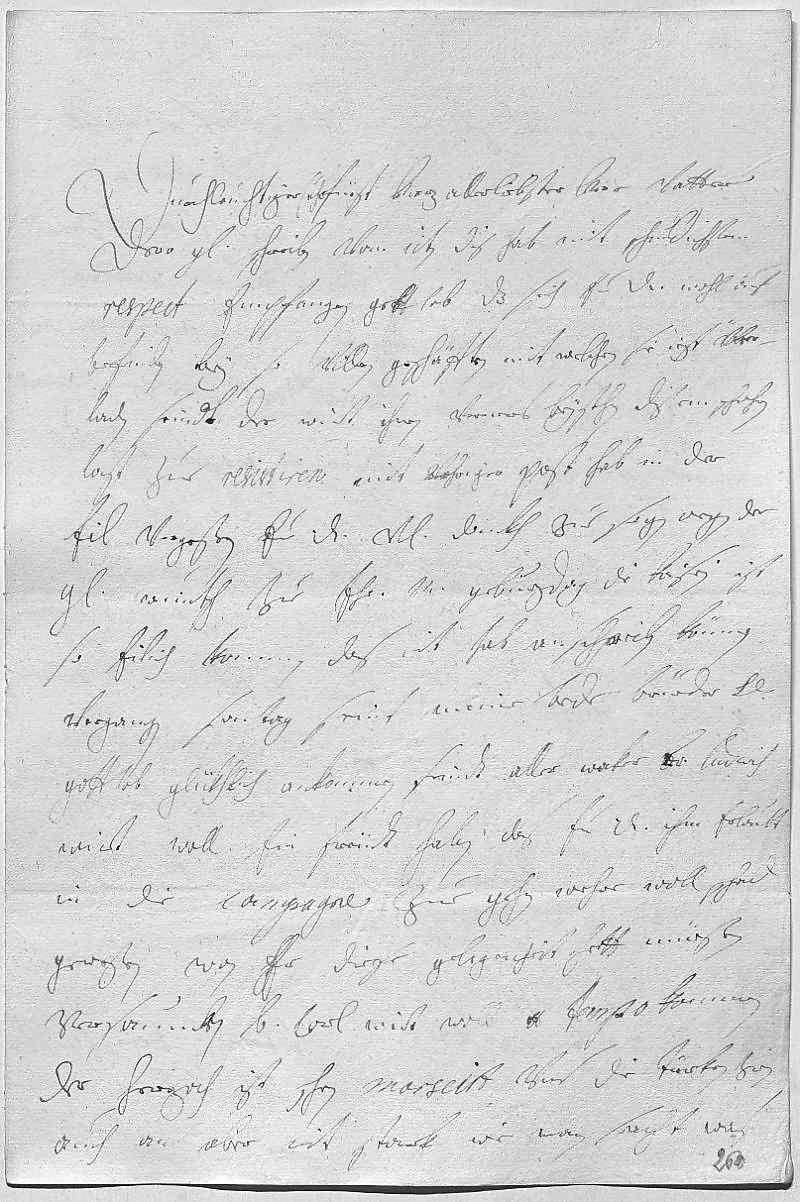 0001Durchleüchtiger Cuhrfürst, herz allerliebster herr vatter 0002Dero gnädiges schreiben vom 11ten dis hab mit schuldichstem 0003respect empfangen. Gott lob, das sich ewer Durchlaucht wohl auf 0004befinden bey so villen geschäfften, mit welchen sie jezt über- 0005laden seindt, der wirt ihnen verners beystehen, disem schwehren 0006last zue resistiren. Mit vohriger post hab in der 0007eil vergeßen, ewer Durchlaucht vnterdehnigsten dankh zue sagen wegen der 0008gnädigen wuntsch zue ihr Mayestät geburzdag, die Kaiserin ist 0009so eilich kommen, das nit hab auschreiben können. 0010Vergangen sontag seint meine bede brüeder Liebden 0011gottlob glükhlich ankommen, seindt aller waker. Bruder Ludwich 0012wirt woll ein freüdt haben, das ewer Durchlaucht ihm erlaubt 0013in die campage zue gehn, wehre woll schad 0014geweßen, wan er diese gelegenheit hett müeßen 0015versaumen. Bruder Carl wirt woll a tempo kommen, 0016der Herzoch ist schon marscirt vnd die türken zien 0017auch an, aber nit stark, wie man sagt. Was