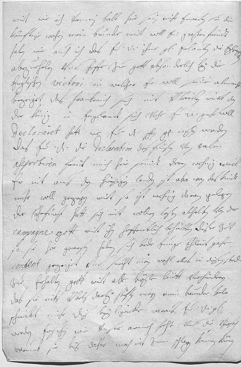 0018wirt, wie ich vermein, balt hier sein, mihr erwarten sie die 0019könftige wochen. Mein brueder wirt woll ein großen freüdt 0020haben wie auch ich, das ewer Durchlaucht ihme gnädigst erlauben, die Erzherzogin 0021abzueholen. Vnd hoffe zue gott, absonderlich bey der 0022englischen victori, in welcher er woll seine almacht 0023bezeiget, das Frankreich sich nit übereilen wirt, dan 0024der König in Engelant sich vohr ewer Durchlaucht gahr woll 0025declarieret hatt, wie ewer Durchlaucht schon gnädigst wißen werden. 0026Das ewer Durchlaucht die declaration des Fürsten von Salm 0027approbiren, freüt mich, hier seindt deren wehnig, weil 0028er nit aus den hiersigen landen ist, aber wan das kindt 0029nuhr woll gezogen wirt, so ist wehnig daran gelegen. 0030Der Cuhrfürst hatt sich nit wollen laßen abhalten von der 0031campagne, gott wirt ihn hoffentlich behüetten. Diße zeit 0032so sie hir gewesen, haben sich bede junge ehleüt gahr 0033content gezeiget vnd suecht man wohl alles in diesen stand 0034zue erhalten, gott wirt alle böse leütt verhinderen, 0035das sie niks übels darbey stiften mögen. Mein brueder Carl 0036schreibt mihr dis bey ligende, waraus ewer Durchlaucht gnädig 0037werden ersehen, wie vnser armeh steht vnd die vhrsach, 0038warumb sie bis dahto noch nit zum schlagen kommen können.