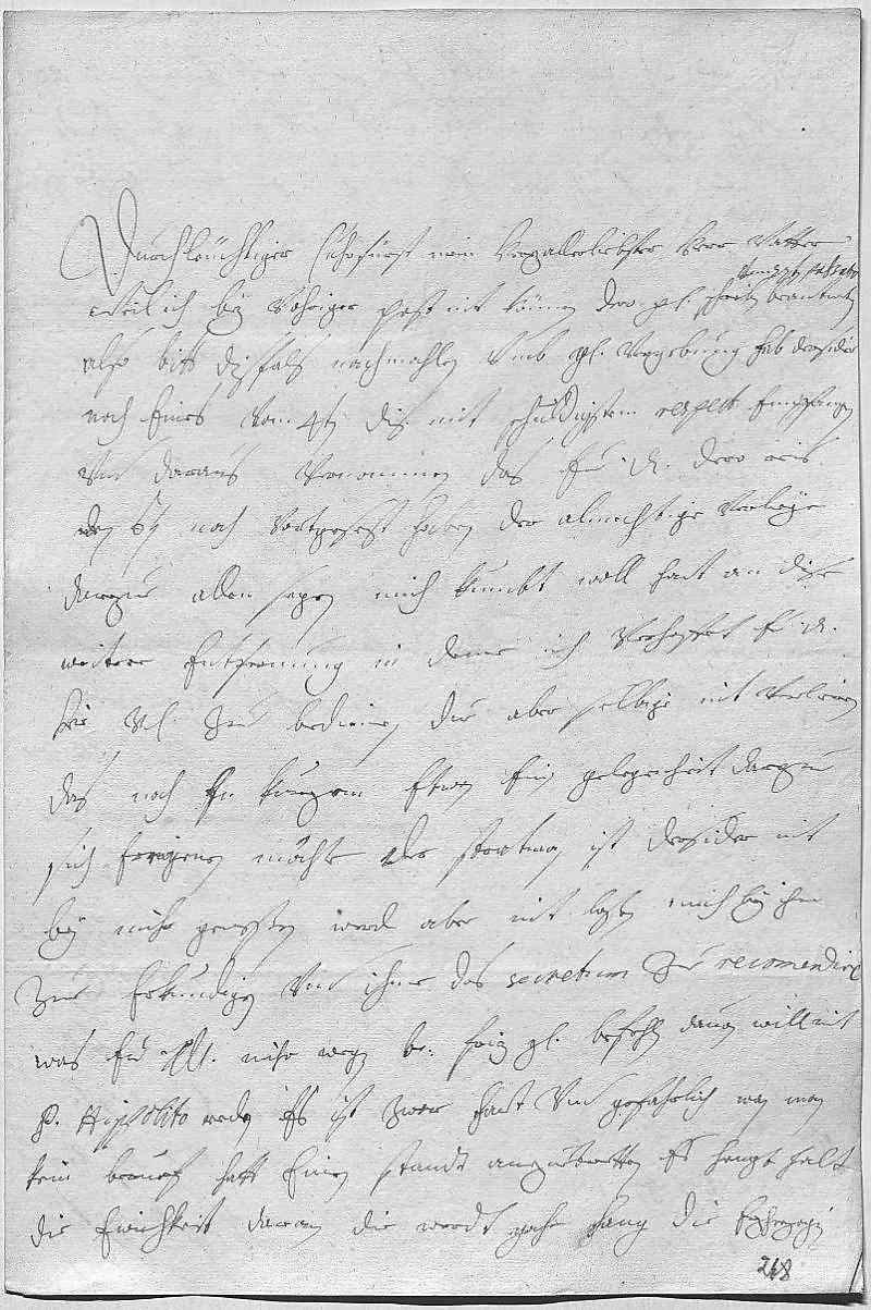 0001Durchleüchtiger Cuhrfürst, mein herzallerliebster herr vatter 0002Weil ich bey vohriger post nit können dero gnädiges schreiben beantworten vom 22ten passato, 0003also bitt disfals nachmahlen vmb gnädige vergebung. Hab dersider 0004noch eines vom 4ten dis mit schuldigstem respect empfangen 0005vnd daraus vernommen, das ewer Durchlaucht dero reis 0006den 6ten noch vortgesezt haben, der almechtige verleye 0007darzue allen segen. Mich kumbt woll hart an dise 0008weitere entfernung, in deme ich verhoffet ewer Durchlaucht 0009hier vnterdehnigst zue bedienen, due aber selbige hoffnung nit verlieren, 0010das noch in kurzem etwan ein gelegenheit darzue 0011sich ereigenen möchte. Der Stratman ist dersider nit 0012bey mihr geweßen, werd aber nit laßen mich bey ihm 0013zue erkundigen vnd ihme das secretum zue recomendiren. 0014Was ewer Durchlaucht mihr wegen bruder Friz gnädigst befehlen, dauon will mit 0015Pater Hippolito reden. Es ist zwar hart vnd gefahrlich, wan man 0016kein beruef hatt, einen standt anzuetretten, es hengt halt 0017die ewichkeit daran, die werdt gahr lang. Die Erzherzogin