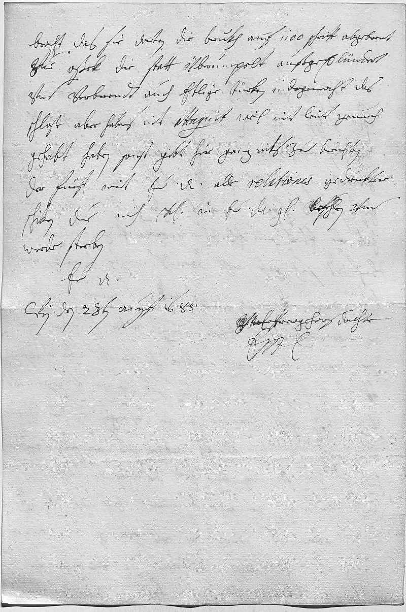 0019bracht, das sie dorten die brukh auf 1100 schritt abgebrent, 0020zue Oßek die statt überumpelt, außgeplündert 0021vnd verbrendt, auch etlige türken nidergemacht, das 0022schloß aber habens nit attaquirt, weil nit leüt genuech 0023gehabt haben. Sonst gibt hier ganz niks zu berichten, 0024der Fürst wirt ewer Durchlaucht alle relationes gedrukter 0025schiken. Due mich vnterdehnigst in ewer Durchlaucht gnade befehlen vnd 0026werde sterben 0027ewer Durchlaucht 0028vnterdehnigste trewgehorsamste dochter 0029EMT 0030Wien den 23ten august 1685