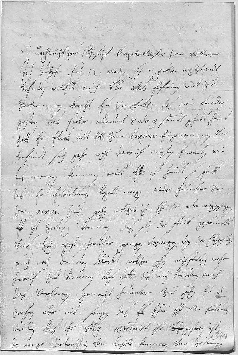 0001Durchleüchtiger Cuhrfürst, herz allerliebster herr vatter 0002Ich verhoffe, ewer Durchlaucht werden sich in guettem wohlstandt 0003befinden, welches mich über alles erfreüen wirt zue 0004vernemmen. Bericht ewer Durchlaucht vnterdehnigst, das mein brueder 0005gestren das fieber widerumb 8 oder 9 stundt gehabt. Heünt 0006hatt er etwas mit erlaubnis zum laxiren eingenommen vnd 0007befindt sich gahr wohl darauf, müeßen erwarten wie 0008es morgen kommen wirt. Er ist heünt so gutt, 0009das er erlaubnus begert, morgen wider hinunter zue 0010der armeé zue gehen, welches ihm ihr Mayestät aber abgeschlagen. 0011Es ist zeitung kommen, das sich der feint gesamelt 0012vnd bey Pest herüber gangen, deswegen dan der Cuhrfürst 0013auch noch drunten bleibt, welcher schon reisfertig wahr 0014herauf zue kommen. Also hatt dis mein bruedern auch 0015das verlangen gemacht hinunter zue gehen, ewer Durchlaucht 0016derfen aber nit sorgen, das es ihm ihr Mayestät erlauben 0017werden, bis er völlich restituirt ist. Vohr Gestern ist 0018der iunge Dietrichstein vom Leßle kommen vnd hat zeitung