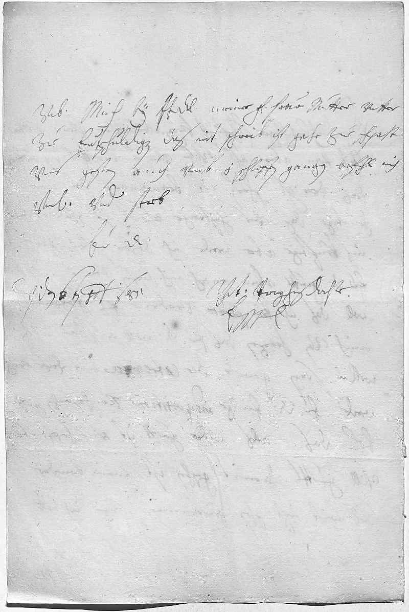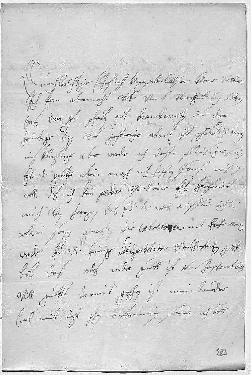 0001Durchleüchtiger Cuhrfürst, herzallerliebster herr vatter 0002Ich kom abermahl vnterdehnigst vmb vergebung bitten, 0003das dero gnädige schreiben nit beantworten due, der 0004heüntige dag vnd gestrige abent ist schuldich daran. 0005Ins könftige aber werde ich desto fleisiger sein, 0006ewer Durchlaucht guette allein macht mich hoffen, sonst weis ich 0007woll, das ich kein perdon verdiene. Es erfrewet 0008mich von herzen, das ewer Durchlaucht woll aufsein, ich bin 0009woll in sorgen geweßen, die entrevue mit Cuhr Meinz 0010werde ewer Durchlaucht einige indisposition veruhrsachen, gott 0011lob, das alles wider guett ist vnd hoffentlich 0012vill guetts darmit geschen ist. Mein brueder 0013Carl wirt iezt schon ankommen sein, ich bitt