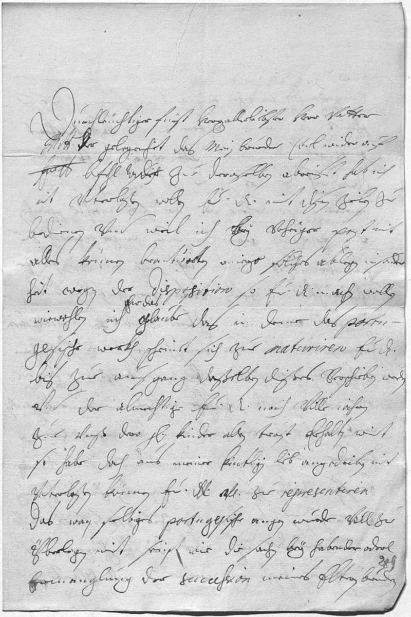 0001Durchleüchtiger Fürst, herz allerliebster herr vatter 0002Mitt der gelegenheit, das mein brueder Carl wider auf 0003ewer Durchlaucht befehl wider zue deroselben abreiset, hab ich 0004nit vnterlaßen wollen, ewer Durchlaucht mit disen zeilen zue 0005bedienen, vnd weil ich bey vohriger post nit 0006alles können beantworten, aniezo solches ablegen, insonder- 0007heit wegen der disposition so ewer Durchlaucht machen wollen. 0008Wiewohlen ich ohne das glaube, das, in deme das portu- 0009gesische werkh scheinet sich zue maturiren, ewer Durchlaucht 0010bis zue ausgang daßelben dißes verschieben werden 0011vnd der almechtige ewer Durchlaucht noch ville iahren 0012zue vnß, dero gehorsamen kinder, allen trost erhalten wirt, 0013so habe doch aus meiner kintligen lieb angedriben nit 0014vnterlaßen können, ewer Durchlaucht vnterdehnigst zue representiren, 0015das, wan selbiges portugesische angen wurde, vill zue 0016überlegen wirt sein, wie die sachen bey habender oder 0017ermanglung der succession meines eltern brudern