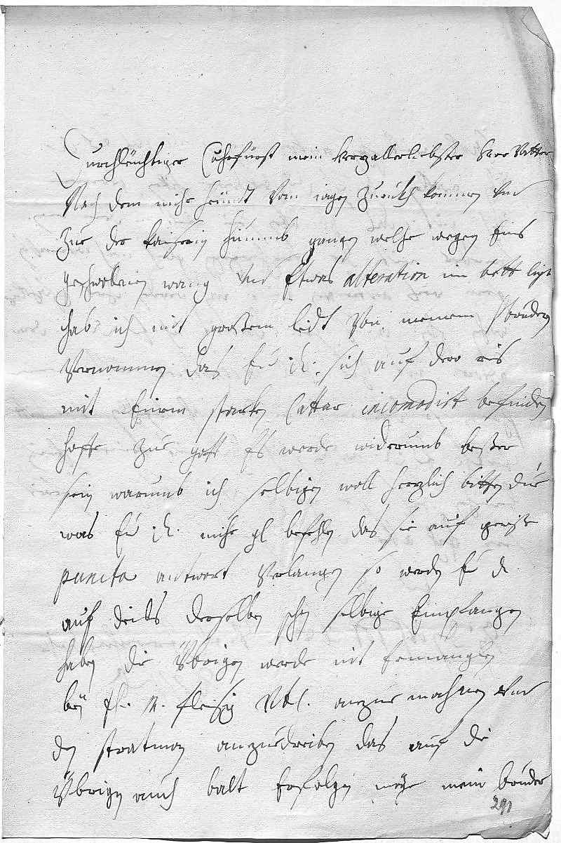 0001Durchleüchtiger Cuhrfürst, mein herzallerliebster herr vatter 0002Nach dem mihr heündt vom iagen zuruckh kommen vnd 0003zue der Kaiserin hinumb gangen, welche wegen eins 0004geschwollenen wang vnd etwas alteration im bett ligt, 0005habe ich mit großem leidt von meinem herrn brudern 0006vernommen, das ewer Durchlaucht sich auf dero reis 0007mit einem starken cattar incomodirt befinden. 0008Hoffe zue gott, es werde widerumb beßer 0009sein, warumb ich selbigen woll herzlich bitten due. 0010Was ewer Durchlaucht mihr gnädigst befehlen, das sie auf gewiße 0011puncta antwort verlangen, so werden ewer Durchlaucht 0012auf deils derselben schon selbige empfangen 0013haben. Die übrigen werde nit ermanglen, 0014bey ihr Mayestät fleisig vnterdehnigst anzue mahnen vnd 0015den Stratman anzuedreiben, das auf die 0016übrigen auch balt erfolgen möge. Mein bruder