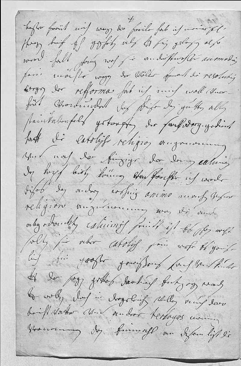 0013beßer geht, freüt mich. Wegen der freile hab ich meiner fraw 0014schwegerin brif eh geschriben, als dero Liebden sein gelesen, also 0015werd halt schauen, woh sie anderstwoh zu accomodirn 0016sein möchte. Wegen der völker erwart die resolution. 0017Wegen der refforma hab ich mich woll vner- 0018hört verwundert, das dise den guetten alten 0019Steinkallenfels getroffen, der so drey gedient 0020hatt, die catolische religion angenommen 0021vnd noch der einzige, der dennen caluinern 0022den kopf bieten können. Vnd förchte ich, werde 0023dises den andren wehnig animo machen, vnser 0024religion anzuenemmen. Wan die andren 0025abgedankten caluinisch seindt, ist es schon recht, 0026solten sie aber catolisch sein, wehr es gewis- 0027lich ein große gewißens sach vnd kunte 0028dero Liebden der segen gottes dardurch entzogen werden. 0029Dero Liebden wollen doch in dergleichen vellen auch dero 0030beichtvatter vnd andere teologos meinung 0031vernemmen, dan einmahl an disem ligt die