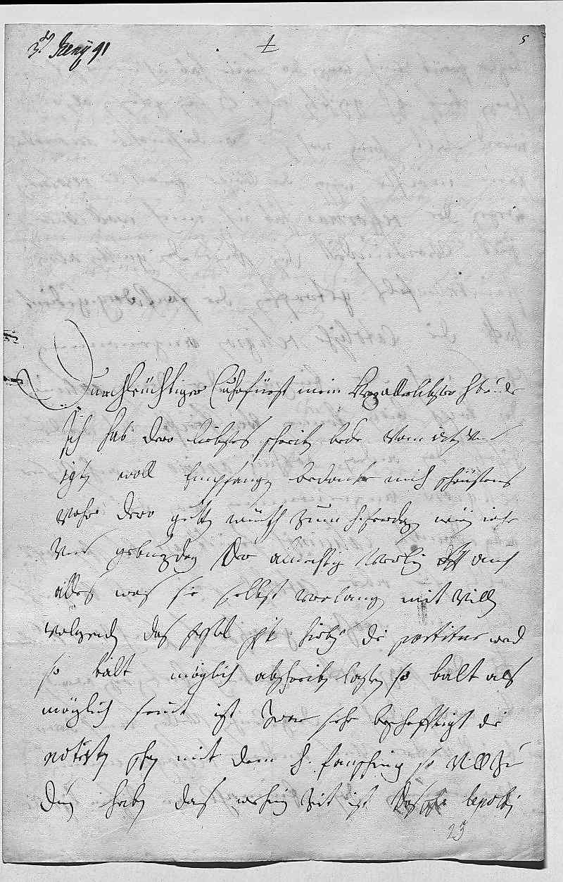 00013ter Jener 910002Durchleüchtiger Cuhrfürst, mein herzallerlibster herr bruder 0003Ich hab dero liebstes schreiben bede vom 12ten vnd 000419ten woll empfangen. Bedanke mich schönstens 0005vohr dero gutten wüntsch zum heiligen feierdagen, newen iahr 0006vnd geburzdag, der almechtig verley dero Liebden auch 0007alles, was sie selbst verlangen mit villen 0008volgenden. Das festel schik hirbey, die partitur werd 0009so balt möglich abschreiben laßen, so balt als 0010möglich, seint izt zwar sehr beschefftigt, die 0011notisten schon mit dem heiligen fansching so vill zu 0012dun haben, das wehnig zeit ist. Das schwester Lepoldin