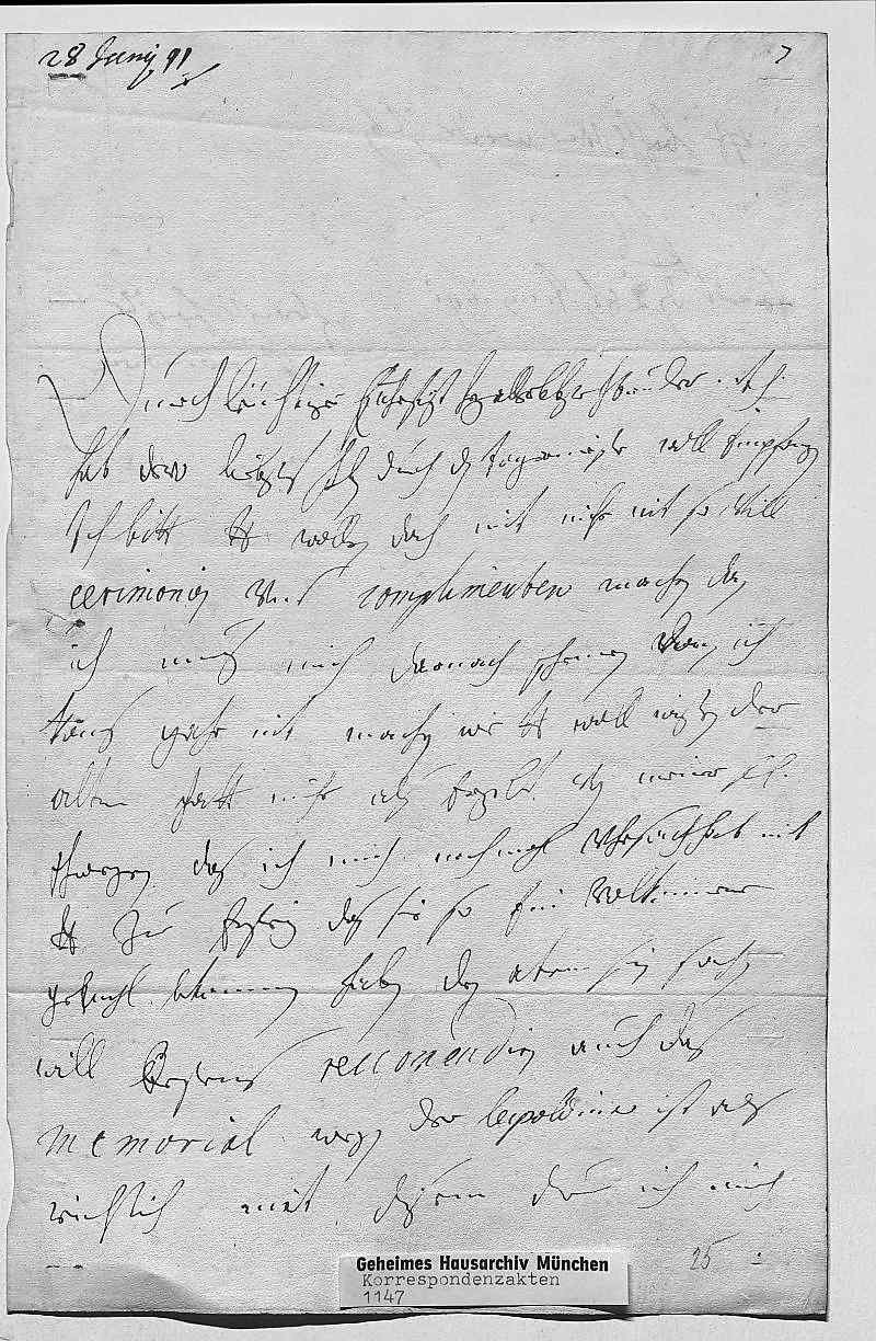 000128 junij 910002Durchleüchtiger Cuhrfürst, herzallerlibster herr bruder unt herr 0003Hab dero liebsts schreiben durch den Iagermeister woll empfangen. 0004Ich bitt, dero Liebden wollen doch mit mihr nit so vill 0005cerimonien vnd complimenten machen, dan 0006ich mus mich darnach schemen, dann ich 0007kans gahr nit machen, wie dero Liebden woll wißen. Der 0008Altem hatt mihr als erzelt von meiner fraw 0009schwegerin, das ich mich nochmahl vhrsach hab mit 0010dero Liebden zu erfreien, das sie so ein volkomene 0011geengl bekommen haben. Den Atem sein sachen 0012will bestens reccomendiren, auch das 0013memorial wegen der Lepoldina, ist als 0014richtich. Mit disem due ich mich